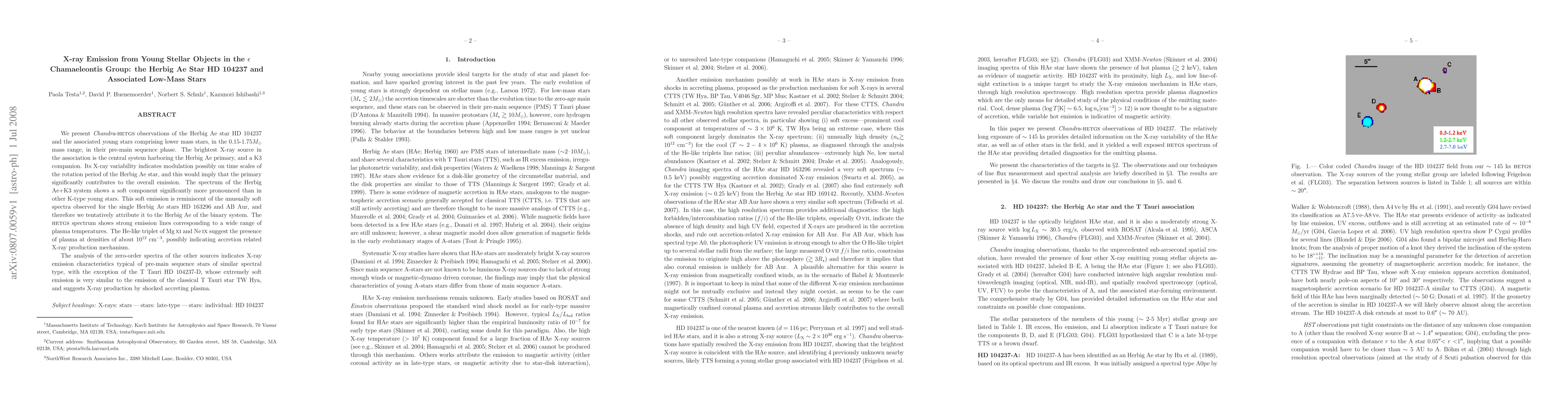 This study uses Chandra-HETGS observations to analyze X-ray emissions from the Herbig Ae star HD 104237 and associated lower mass stars, revealing significant soft X-ray variability and emission likely from accretion processes. The soft X-ray spectrum of the Herbig Ae+K3 system is notably similar to other Herbig Ae stars, suggesting a common accretion mechanism.
