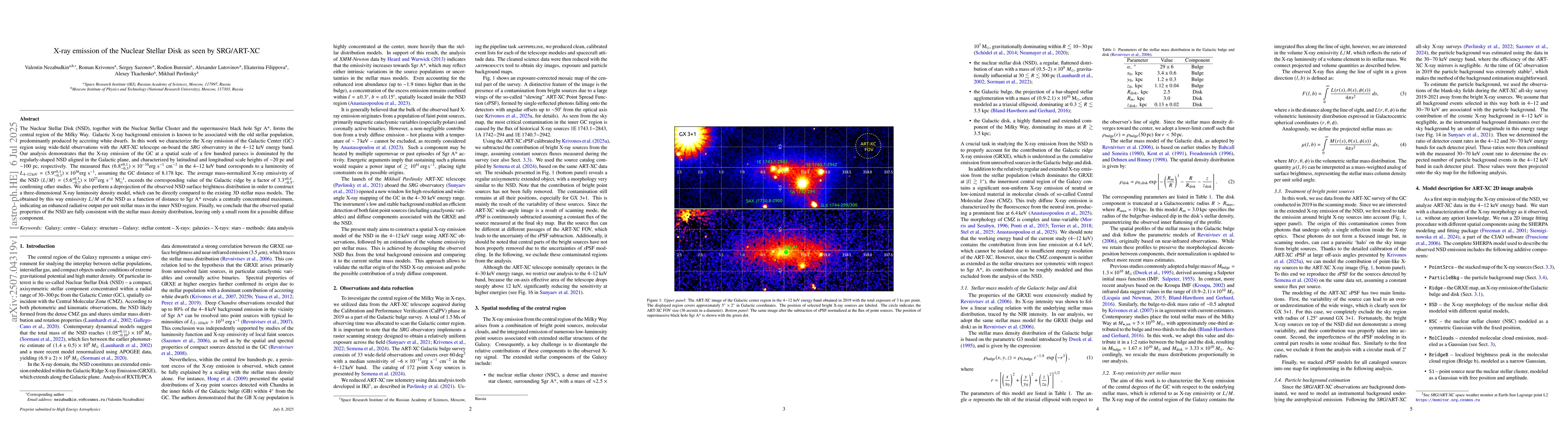 The Nuclear Stellar Disk (NSD), together with the Nuclear Stellar Cluster and the supermassive black hole Sgr A*, forms the central region of the Milky Way. Galactic X-ray background emission is known to be associated with the old stellar population, predominantly produced by accreting white dwarfs. In this work we characterize the X-ray emission of the Galactic Center (GC) region using wide-field observations with the ART-XC telescope on board the SRG observatory in the 4-12 keV energy band. Our analysis demonstrates that the X-ray emission of the GC at a spatial scale of a few hundred parsecs is dominated by the regularly shaped NSD aligned in the Galactic plane, and characterized by latitudinal and longitudinal scale heights of approximately 20 pc and approximately 100 pc, respectively. The measured flux, 6.8 (+0.1, -0.3) x 10^-10 erg/s/cm^2 in the 4-12 keV band, corresponds to a luminosity of 5.9 (+0.1, -0.3) x 10^36 erg/s, assuming the GC distance of 8.178 kpc. The average mass-normalized X-ray emissivity of the NSD, 5.6 (+0.5, -0.7) x 10^27 erg/s/M_sun, exceeds the corresponding value of the Galactic ridge by a factor of 3.3 (+0.4, -0.5), confirming other studies. We also perform a deprojection of the observed NSD surface brightness distribution in order to construct a three-dimensional X-ray luminosity density model, which can be directly compared to the existing three-dimensional stellar mass models. The emissivity of the NSD as a function of distance to Sgr A* reveals a centrally concentrated maximum, indicating an enhanced radiative output per unit stellar mass in the inner NSD region. Finally, we conclude that the observed spatial properties of the NSD are fully consistent with the stellar mass density distribution, leaving only a small room for a possible diffuse component.