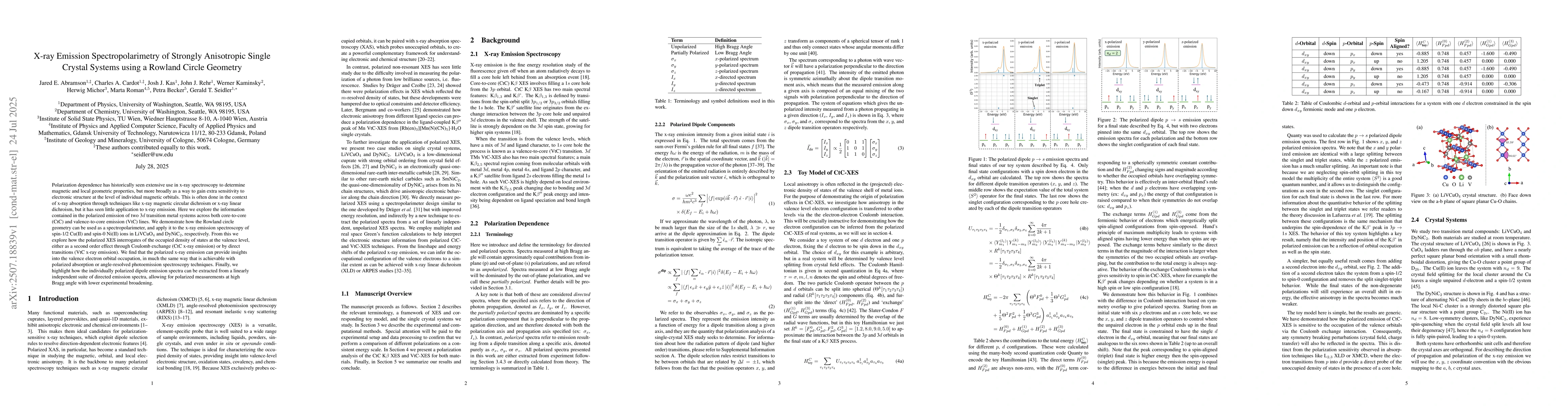 Polarization dependence has historically seen extensive use in x-ray spectroscopy to determine magnetic and local geometric properties, but more broadly as a way to gain extra sensitivity to electronic structure at the level of individual magnetic orbitals. This is often done in the context of x-ray absorption through techniques like x-ray magnetic circular dichroism or x-ray linear dichroism, but it has seen little application to x-ray emission. Here we explore the information contained in the polarized emission of two 3d transition metal systems across both core-to-core (CtC) and valence-to-core emission (VtC) lines. We demonstrate how the Rowland circle geometry can be used as a spectropolarimeter, and apply it to the x-ray emission spectroscopy of spin-1/2 Cu(II) and spin-0 Ni(II) ions in LiVCuO4 and DyNiC2, respectively. From this we explore how the polarized XES interrogates of the occupied density of states at the valence level, either as a second order effect through Coulomb exchange (CtC x-ray emission) or by direct transitions (VtC x-ray emission). We find that the polarized x-ray emission can provide insights into the valence electron orbital occupation, in much the same way that is achievable with polarized absorption or angle-resolved photoemission spectroscopy techniques. Finally, we highlight how the individually polarized dipole emission spectra can be extracted from a linearly independent suite of directed emission spectra, allowing for polarized measurements at high Bragg angle with lower experimental broadening.