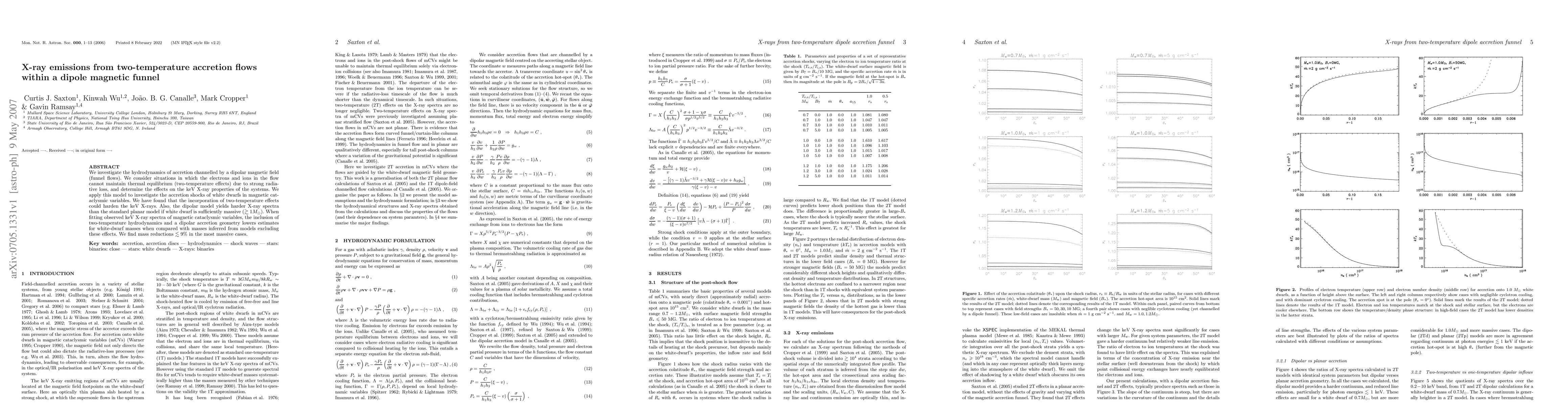 We investigate the hydrodynamics of accretion channelled by a dipolar magnetic field (funnel flows). We consider situations in which the electrons and ions in the flow cannot maintain thermal equilibrium (two-temperature effects) due to strong radiative loss, and determine the effects on the keV X-ray properties of the systems. We apply this model to investigate the accretion shocks of white dwarfs in magnetic cataclysmic variables. We have found that the incorporation of two-temperature effects could harden the keV X-rays. Also, the dipolar model yields harder X-ray spectra than the standard planar model if white dwarf is sufficiently massive (>~1M_sun). When fitting observed keV X-ray spectra of magnetic cataclysmic variables, the inclusion of two-temperature hydrodynamics and a dipolar accretion geometry lowers estimates for white-dwarf masses when compared with masses inferred from models excluding these effects. We find mass reductions <~9% in the most massive cases.