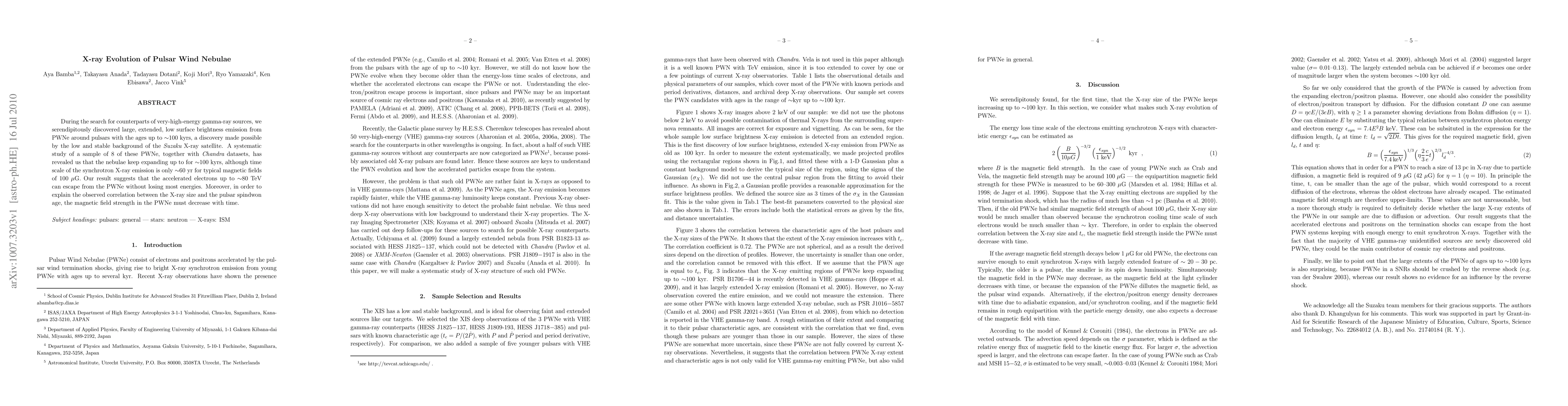 During the search for counterparts of very-high-energy gamma-ray sources, we serendipitously discovered large, extended, low surface brightness emission from PWNe around pulsars with the ages up to ~100 kyrs, a discovery made possible by the low and stable background of the Suzaku X-ray satellite. A systematic study of a sample of 8 of these PWNe, together with Chandra datasets, has revealed us that the nebulae keep expanding up to for ~100 kyrs, although time scale of the synchrotron X-ray emission is only ~60 yr for typical magnetic fields of 100 microG. Our result suggests that the accelerated electrons up to ~80 TeV can escape from the PWNe without losing most energies. Moreover, in order to explain the observed correlation between the X-ray size and the pulsar spindwon age, the magnetic field strength in the PWNe must decrease with time.