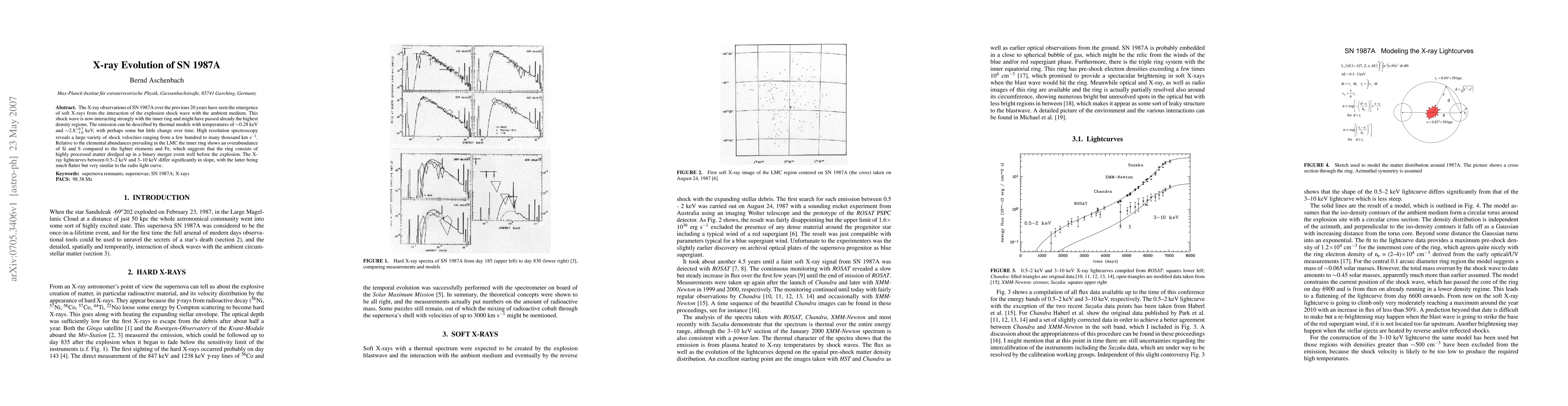 The X-ray evolution of SN 1987A reveals soft X-ray emissions from the shock wave interacting with the surrounding medium, particularly the inner ring, which shows an overabundance of Si and S. The X-ray lightcurves exhibit different slopes, with the higher energy range resembling the radio light curve.