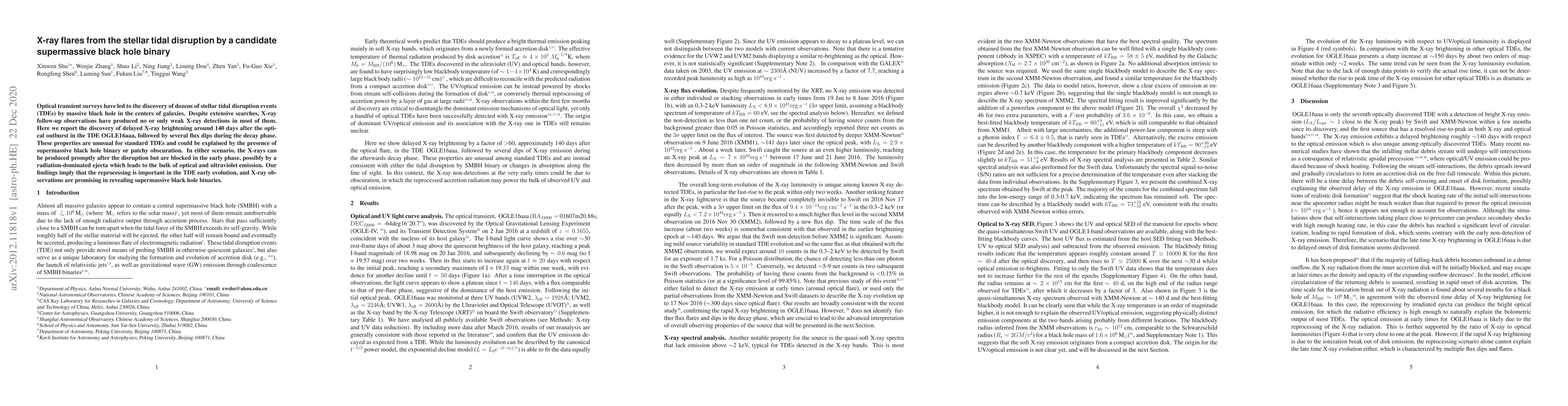 The paper presents detailed X-ray and UV/optical data analysis of OGLE16aaa, offering insights into the delayed X-ray brightening and multiple flux dips during the decay phase, which are interpreted as evidence for a supermassive black hole binary.