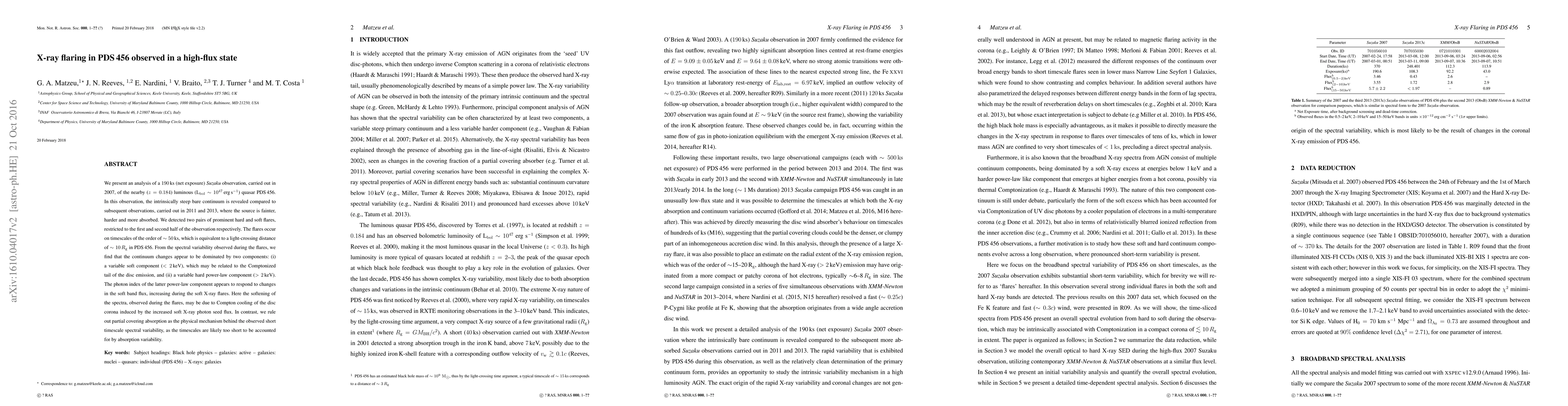 We present an analysis of a $190$\,ks (net exposure) \textit{Suzaku} observation, carried out in 2007, of the nearby ($z=0.184$) luminous (L$_{\rm bol}\sim10^{47}$\,erg\,s$^{-1}$) quasar PDS\,456. In this observation, the intrinsically steep bare continuum is revealed compared to subsequent observations, carried out in 2011 and 2013, where the source is fainter, harder and more absorbed. We detected two pairs of prominent hard and soft flares, restricted to the first and second half of the observation respectively. The flares occur on timescales of the order of $\sim50$\,ks, which is equivalent to a light-crossing distance of $\sim10\,R_{\rm g}$ in PDS\,456. From the spectral variability observed during the flares, we find that the continuum changes appear to be dominated by two components: (i) a variable soft component ($<2$\,keV), which may be related to the Comptonized tail of the disc emission, and (ii) a variable hard power-law component ($>2$\,keV). The photon index of the latter power-law component appears to respond to changes in the soft band flux, increasing during the soft X-ray flares. Here the softening of the spectra, observed during the flares, may be due to Compton cooling of the disc corona induced by the increased soft X-ray photon seed flux. In contrast, we rule out partial covering absorption as the physical mechanism behind the observed short timescale spectral variability, as the timescales are likely too short to be accounted for by absorption variability.