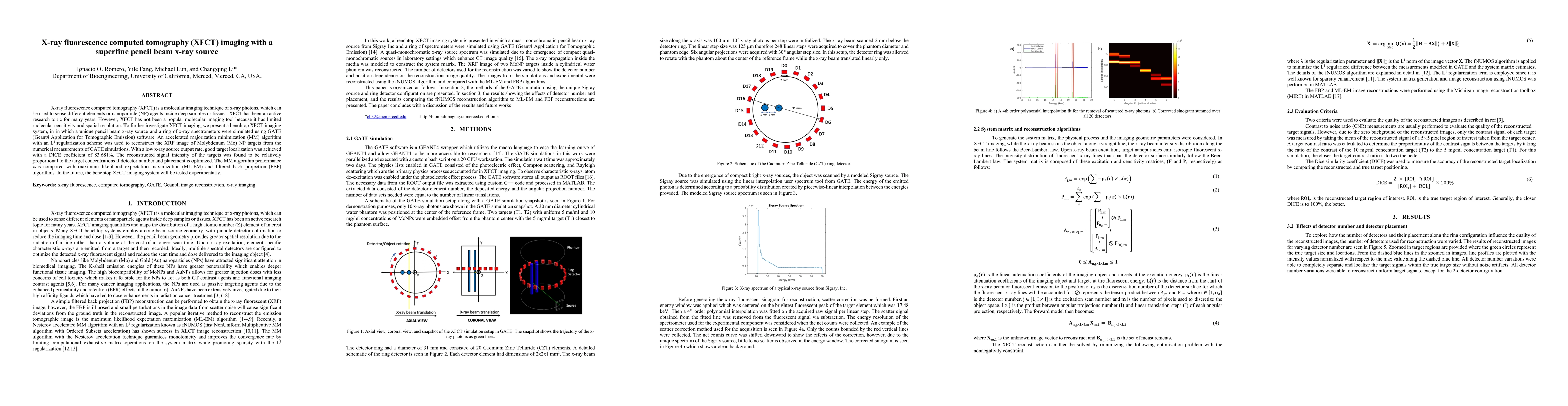 This paper presents a benchtop X-ray fluorescence computed tomography (XFCT) imaging system utilizing a superfine pencil beam x-ray source and an L1 regularization algorithm for improved molecular sensitivity and spatial resolution. The system's performance was evaluated using GATE simulations and compared to other reconstruction algorithms, showing promising results for future experimental testing.