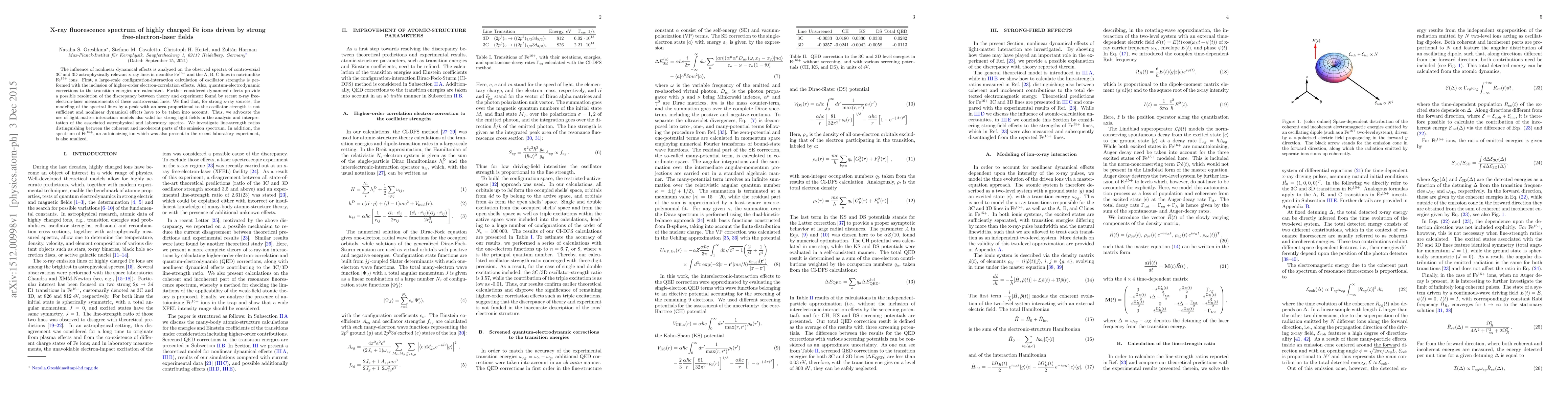 The influence of nonlinear dynamical effects is analyzed on the observed spectra of controversial 3C and 3D astrophysically relevant x-ray lines in neonlike Fe${}^{16+}$ and the A, B, C lines in natriumlike Fe${}^{15+}$ ions. First, a large-scale configuration-interaction calculation of oscillator strengths is performed with the inclusion of higher-order electron-correlation effects. Also, quantum-electrodynamic corrections to the transition energies are calculated. Further considered dynamical effects provide a possible resolution of the discrepancy between theory and experiment found by recent x-ray free-electron-laser measurements of these controversial lines. We find that, for strong x-ray sources, the modeling of the spectral lines by a peak with an area proportional to the oscillator strength is not sufficient and nonlinear dynamical effects have to be taken into account. Thus, we advocate the use of light-matter-interaction models also valid for strong light fields in the analysis and interpretation of the associated astrophysical and laboratory spectra. We investigate line-strength ratios distinguishing between the coherent and incoherent parts of the emission spectrum. In addition, the spectrum of Fe${}^{15+}$, an autoionizing ion which was also present in the recent laboratory experiment, is also analized.
