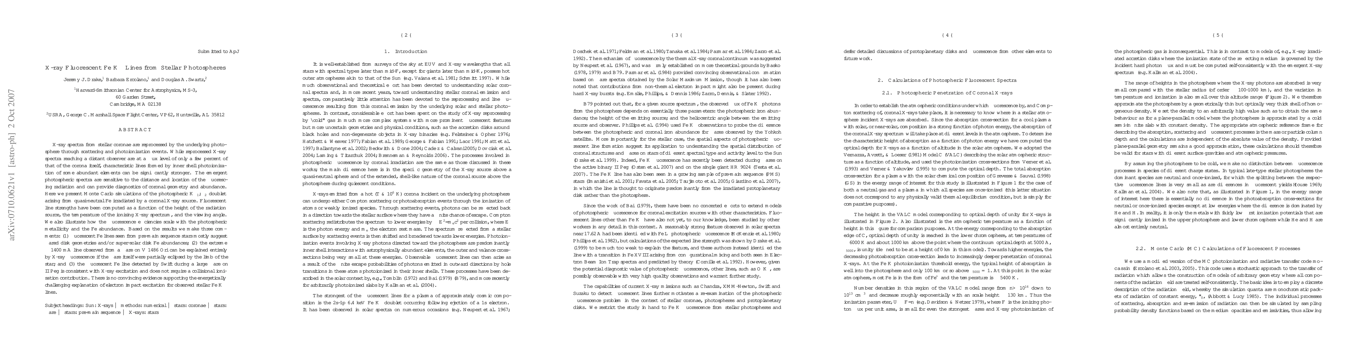 X-ray spectra from stellar coronae are reprocessed by the underlying photosphere through scattering and photoionization events. While reprocessed X-ray spectra reaching a distant observer are at a flux level of only a few percent of that of the corona itself, characteristic lines formed by inner shell photoionization of some abundant elements can be significantly stronger. The emergent photospheric spectra are sensitive to the distance and location of the fluorescing radiation and can provide diagnostics of coronal geometry and abundance. Here we present Monte Carlo simulations of the photospheric Kalpha doublet arising from quasi-neutral Fe irradiated by a coronal X-ray source. Fluorescent line strengths have been computed as a function of the height of the radiation source, the temperature of the ionising X-ray spectrum, and the viewing angle. We also illustrate how the fluorescence efficiencies scale with the photospheric metallicity and the Fe abundance. Based on the results we make three comments: (1) fluorescent Fe lines seen from pre-main sequence stars mostly suggest flared disk geometries and/or super-solar disk Fe abundances; (2) the extreme ~1400 mA line observed from a flare on V1486 Ori can be explained entirely by X-ray fluorescence if the flare itself were partially eclipsed by the limb of the star; and (3) the fluorescent Fe line detected by Swift during a large flare on II Peg is consistent with X-ray excitation and does not require a collisional ionisation contribution. There is no convincing evidence supporting the energetically challenging explanation of electron impact excitation for observed stellar Fe Kalpha lines.