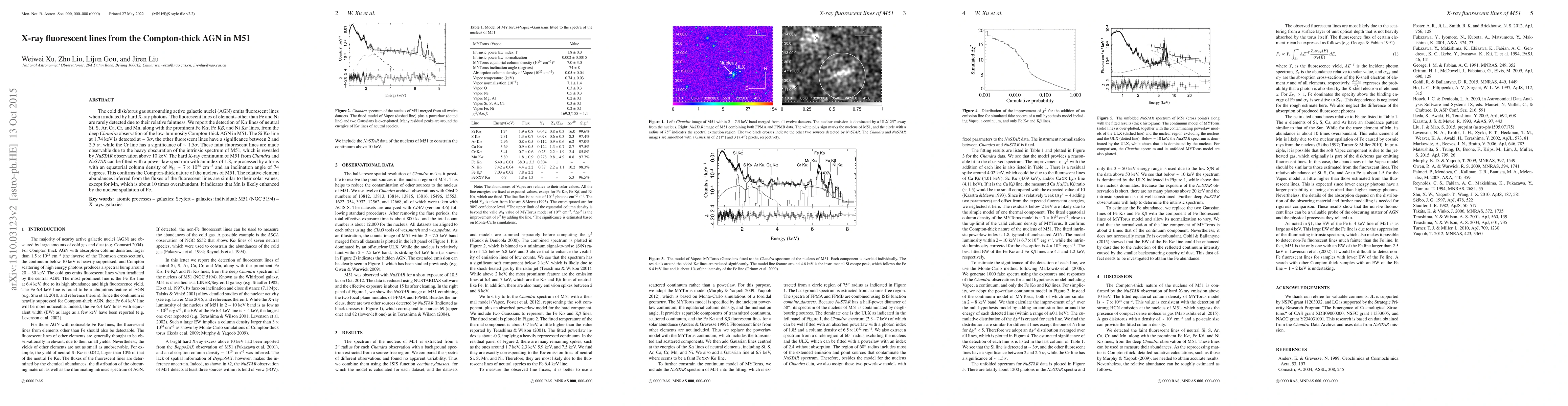 The research utilized deep Chandra observations and NuSTAR data to detect X-ray fluorescent lines from the Compton-thick AGN in M51, employing the MYTorus model for the hard X-ray continuum and Vapec for the soft component.