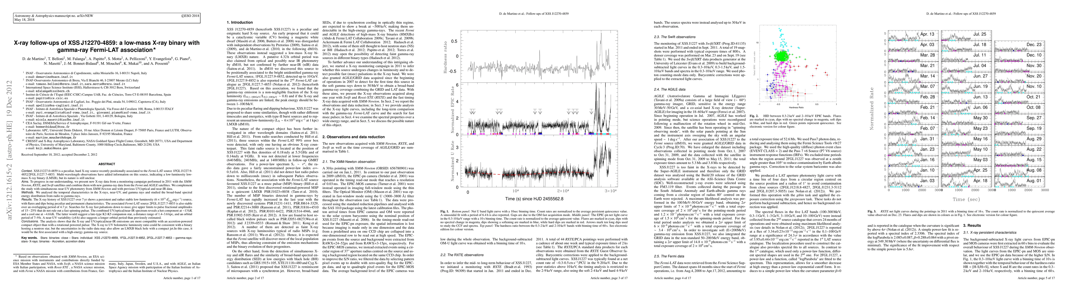 This paper presents X-ray follow-ups of the low-mass X-ray binary XSSJ1227.0-4859, revealing a stable, low-luminosity source with persistent flares and dips, suggesting an accretion-powered compact object. The analysis favors a neutron star in a binary system, though a black hole with a compact jet cannot be ruled out.