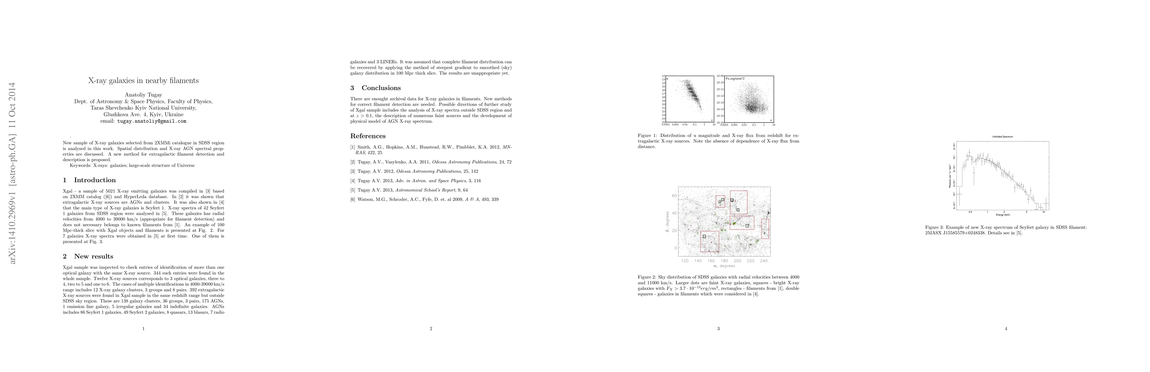 New sample of X-ray galaxies selected from 2XMMi catalogue in SDSS region is analysed in this work. Spatial distribution and X-ray AGN spectral properties are discussed. A new method for extragalactic filament detection and description is proposed.
