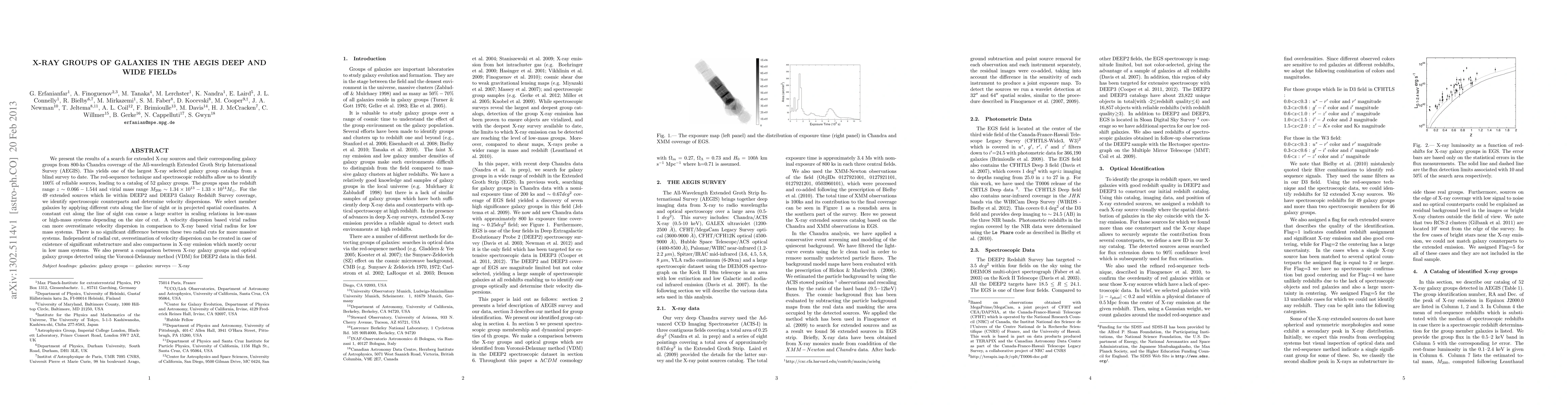 This study identifies 52 galaxy groups from X-ray data in the Aegis Deep and Wide Fields using Chandra observations, spanning a wide redshift range and mass range. The research highlights the challenges in accurately determining velocity dispersions for low-mass systems due to substructure and compactness in X-ray emission.