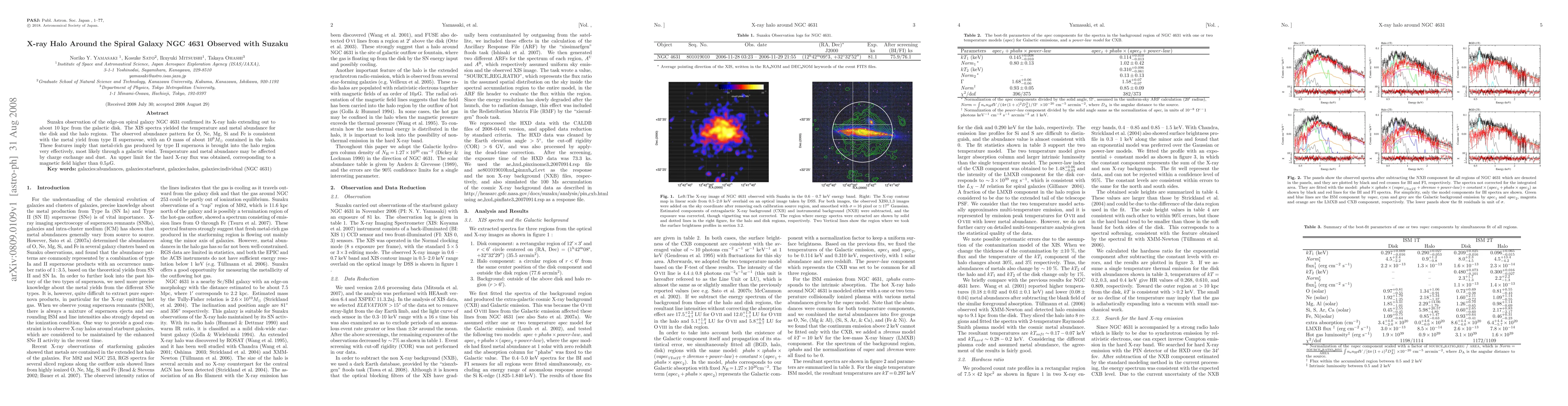Suzaku observation of the edge-on spiral galaxy NGC 4631 confirmed its X-ray halo extending out to about 10 kpc from the galactic disk. The XIS spectra yielded the temperature and metal abundance for the disk and the halo regions. The observed abundance pattern for O, Ne, Mg, Si and Fe is consistent with the metal yield from type II supernovae, with an O mass of about 1E6 Msun contained in the halo. These features imply that metal-rich gas produced by type II supernova is brought into the halo region very effectively, most likely through a galactic wind. Temperature and metal abundance may be affected by charge exchange and dust. An upper limit for the hard X-ray flux was obtained, corresponding to a magnetic field higher than 0.5 uG.