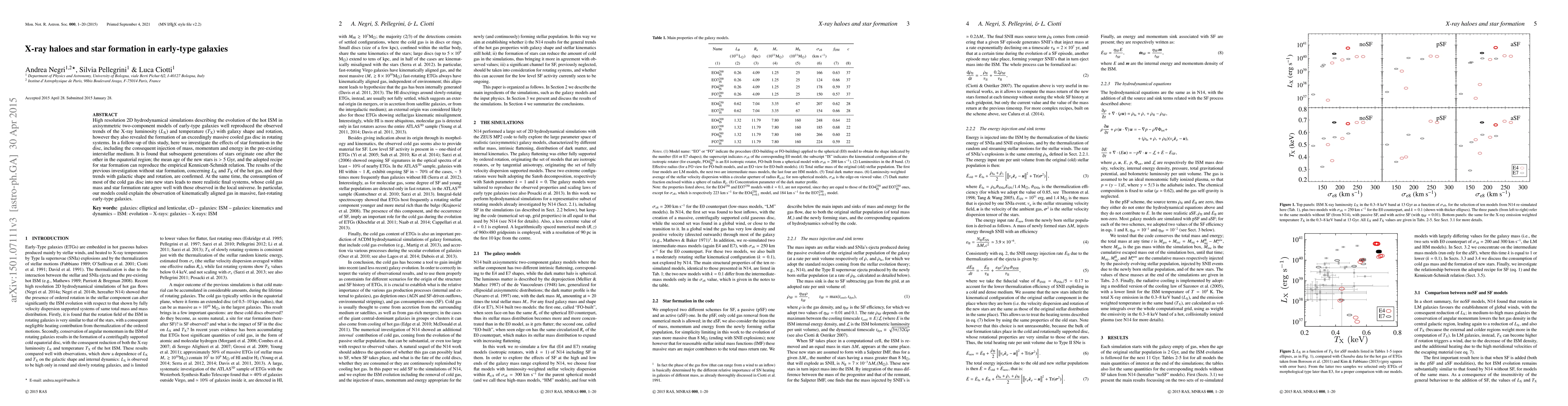 High resolution 2D hydrodynamical simulations describing the evolution of the hot ISM in axisymmetric two-component models of early-type galaxies well reproduced the observed trends of the X-ray luminosity ($L_\mathrm{x}$) and temperature ($T_\mathrm{x}$) with galaxy shape and rotation, however they also revealed the formation of an exceedingly massive cooled gas disc in rotating systems. In a follow-up of this study, here we investigate the effects of star formation in the disc, including the consequent injection of mass, momentum and energy in the pre-existing interstellar medium. It is found that subsequent generations of stars originate one after the other in the equatorial region; the mean age of the new stars is $> 5$ Gyr, and the adopted recipe for star formation can reproduce the empirical Kennicutt-Schmidt relation. The results of the previous investigation without star formation, concerning $L_\mathrm{x}$ and $T_\mathrm{x}$ of the hot gas, and their trends with galactic shape and rotation, are confirmed. At the same time, the consumption of most of the cold gas disc into new stars leads to more realistic final systems, whose cold gas mass and star formation rate agree well with those observed in the local universe. In particular, our models could explain the observation of kinematically aligned gas in massive, fast-rotating early-type galaxies.