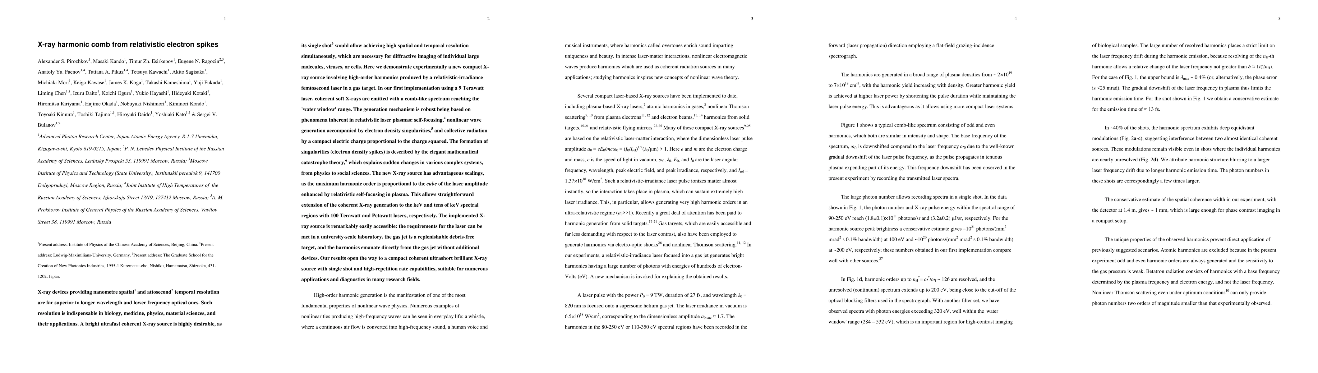 X-ray devices are far superior to optical ones for providing nanometre spatial and attosecond temporal resolutions. Such resolution is indispensable in biology, medicine, physics, material sciences, and their applications. A bright ultrafast coherent X-ray source is highly desirable, for example, for the diffractive imaging of individual large molecules, viruses, or cells. Here we demonstrate experimentally a new compact X-ray source involving high-order harmonics produced by a relativistic-irradiance femtosecond laser in a gas target. In our first implementation using a 9 Terawatt laser, coherent soft X-rays are emitted with a comb-like spectrum reaching the 'water window' range. The generation mechanism is robust being based on phenomena inherent in relativistic laser plasmas: self-focusing, nonlinear wave generation accompanied by electron density singularities, and collective radiation by a compact electric charge. The formation of singularities (electron density spikes) is described by the elegant mathematical catastrophe theory, which explains sudden changes in various complex systems, from physics to social sciences. The new X-ray source has advantageous scalings, as the maximum harmonic order is proportional to the cube of the laser amplitude enhanced by relativistic self-focusing in plasma. This allows straightforward extension of the coherent X-ray generation to the keV and tens of keV spectral regions. The implemented X-ray source is remarkably easily accessible: the requirements for the laser can be met in a university-scale laboratory, the gas jet is a replenishable debris-free target, and the harmonics emanate directly from the gas jet without additional devices. Our results open the way to a compact coherent ultrashort brilliant X-ray source with single shot and high-repetition rate capabilities, suitable for numerous applications and diagnostics in many research fields.