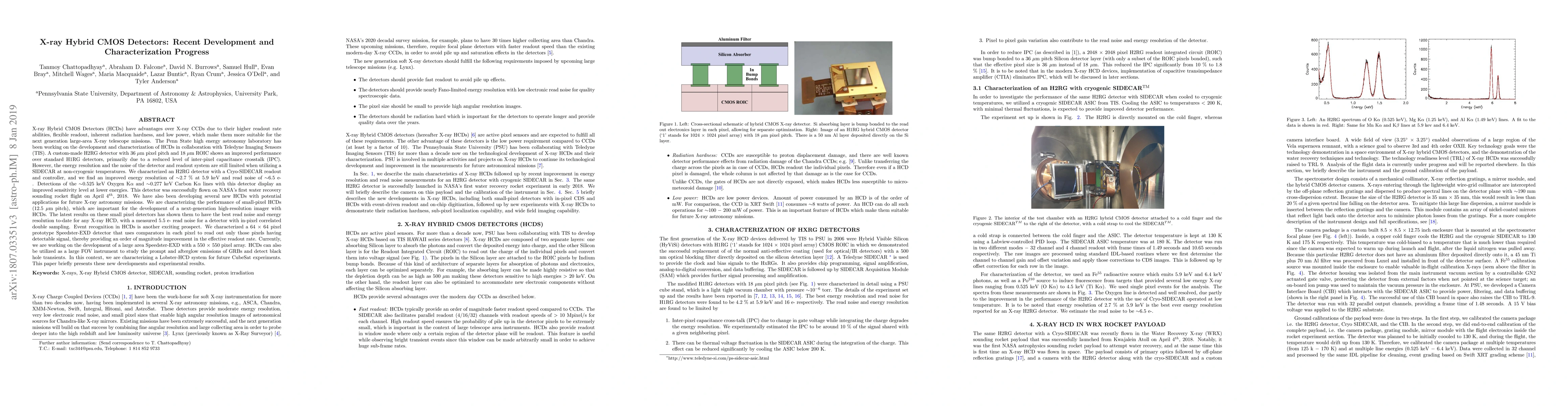 This paper discusses the advancements in X-ray Hybrid CMOS Detectors (HCDs) developed by Penn State in collaboration with Teledyne Imaging Sensors, highlighting improved energy resolution and read noise. The HCDs, including the H2RG detector, are being characterized for applications in next-generation X-ray telescopes and CubeSat missions, showcasing significant improvements in readout rate and large field-of-view capabilities.