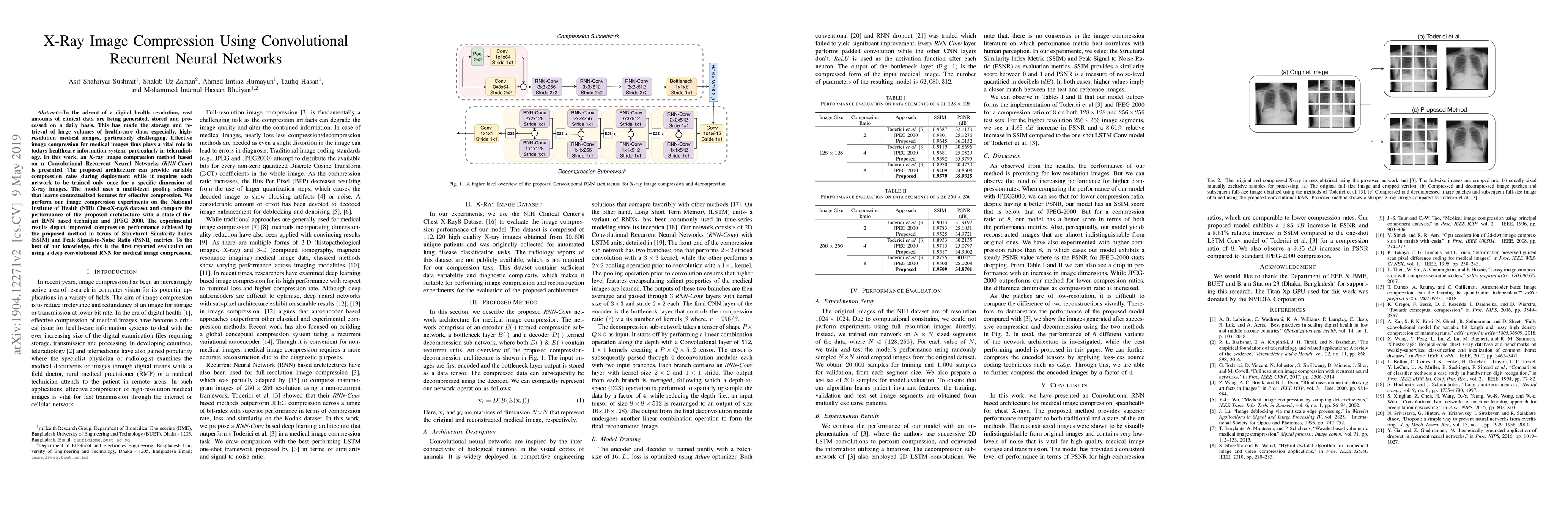 This paper proposes an X-ray image compression method using Convolutional Recurrent Neural Networks (RNN-Conv) that achieves better compression performance compared to state-of-the-art techniques and JPEG 2000, as demonstrated by higher SSIM and PSNR metrics on the NIH ChestX-ray8 dataset. The method offers variable compression rates and requires training only once per image dimension.