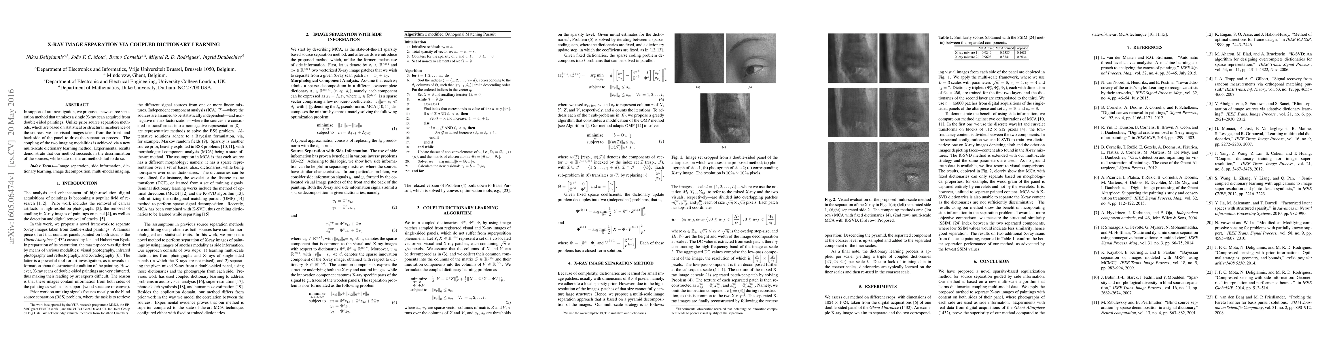 This paper proposes a novel method for unmixing X-ray scans of double-sided paintings using coupled dictionary learning, driven by visual images from both sides of the panel. The method outperforms existing state-of-the-art techniques in source discrimination.