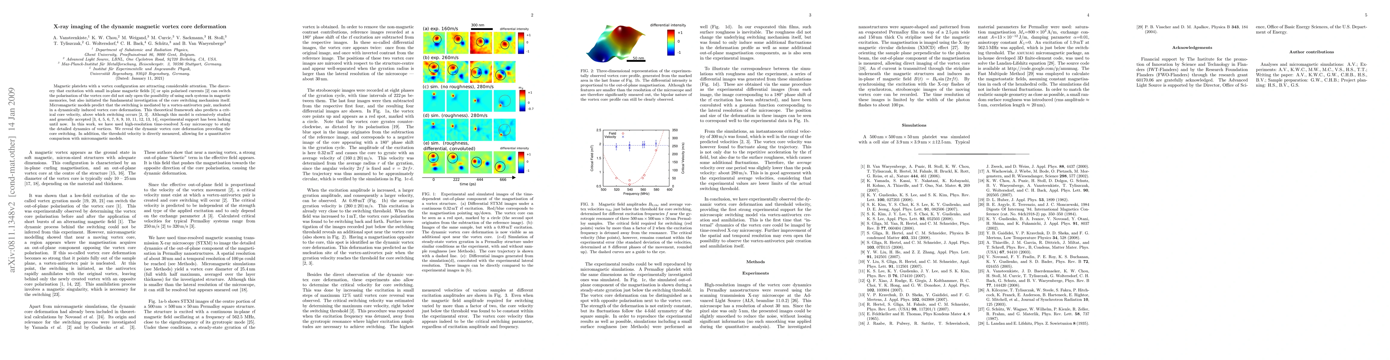 Magnetic platelets with a vortex configuration are attracting considerable attention. The discovery that excitation with small in-plane magnetic fields or spin polarised currents can switch the polarisation of the vortex core did not only open the possibility of using such systems in magnetic memories, but also initiated the fundamental investigation of the core switching mechanism itself. Micromagnetic models predict that the switching is mediated by a vortex-antivortex pair, nucleated in a dynamically induced vortex core deformation. In the same theoretical framework, a critical core velocity is predicted, above which switching occurs. Although these models are extensively studied and generally accepted, experimental support has been lacking until now. In this work, we have used high-resolution time-resolved X-ray microscopy to study the detailed dynamics in vortex structures. We could reveal the dynamic vortex core deformation preceding the core switching. Also, the threshold velocity could be measured, giving quantitative comparison with micromagnetic models.