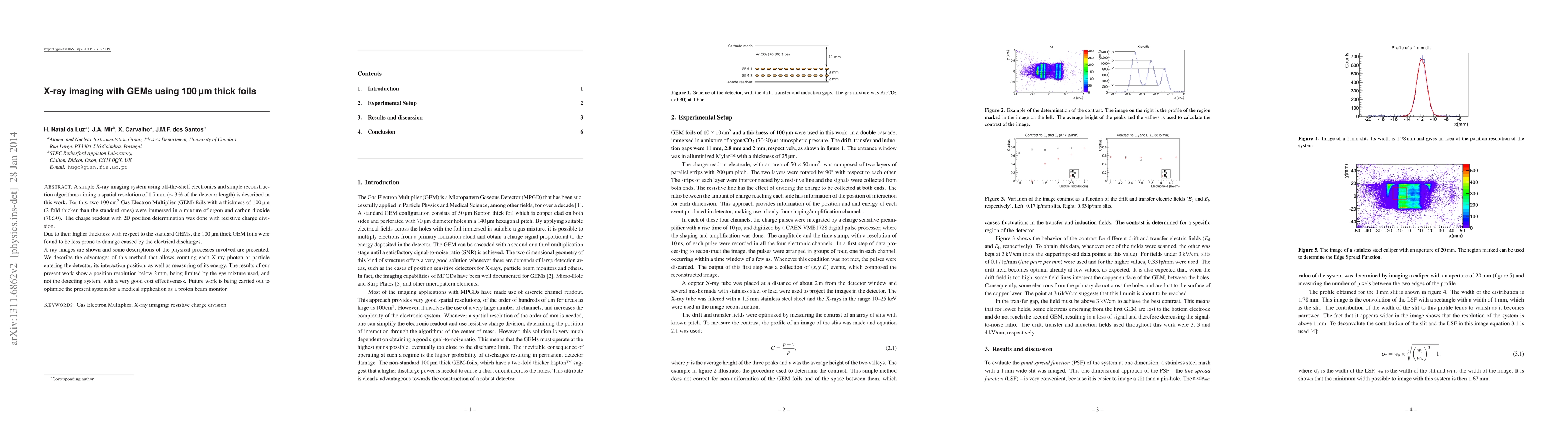 A simple X-ray imaging system using off-the-shelf electronics and simple reconstruction algorithms aiming a spatial resolution of 1.7 mm ($\sim 3\,\%$ of the detector length) is described in this work. For this, two 100 cm$^2$ Gas Electron Multiplier (GEM) foils with a thickness of 100 \mu m (2-fold thicker than the standard ones) were immersed in a mixture of argon and carbon dioxide (70:30). The charge readout with 2D position determination was done with resistive charge division. Due to their higher thickness with respect to the standard GEMs, the 100 \mu m thick GEM foils were found to be less prone to damage caused by the electrical discharges. X-ray images are shown and some descriptions of the physical processes involved are presented. We describe the advantages of this method that allows counting each X-ray photon or particle entering the detector, its interaction position, as well as measuring of its energy. The results of our present work show a position resolution below 2 mm, being limited by the gas mixture used, and not the detecting system, with a very good cost effectiveness. Future work is being carried out to optimize the present system for a medical application as a proton beam monitor.