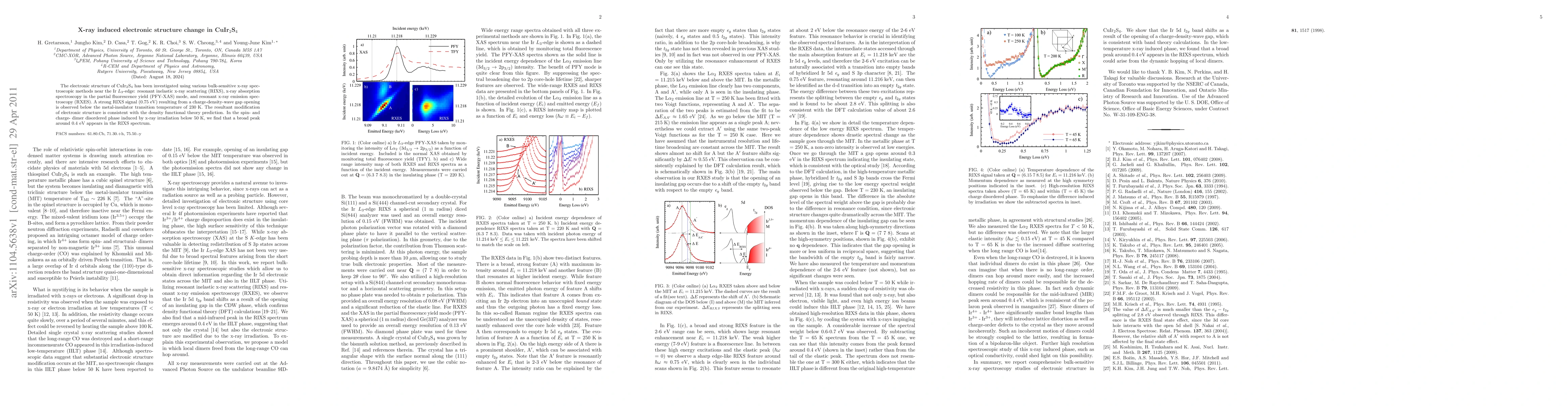 Researchers investigated the electronic structure of CuIr$_2$S$_4$ using x-ray spectroscopic methods after irradiation, finding a charge-density-wave gap opening and a broad peak in the RIXS spectrum below 50K.