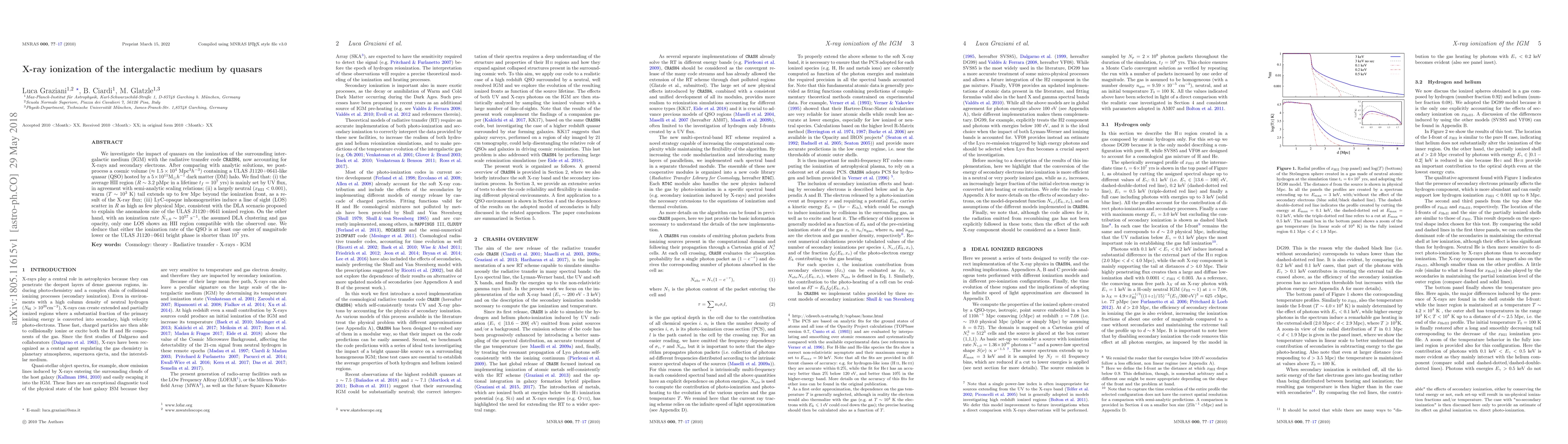 We investigate the impact of quasars on the ionization of the surrounding intergalactic medium (IGM) with the radiative transfer code \texttt{CRASH4}, now accounting for X-rays and secondary electrons. After comparing with analytic solutions, we post-process a cosmic volume ($ \approx 1.5\times 10^4$ Mpc$^3 h^{-3}$) containing a ULAS J1120+0641-like quasar (QSO) hosted by a $5 \times 10^{11} {\rm M}_\odot h^{-1}$ dark matter (DM) halo. We find that: (i) the average HII region ($R\sim3.2$~pMpc in a lifetime $t_f = 10^7$~yrs) is mainly set by UV flux, in agreement with semi-analytic scaling relations; (ii) a largely neutral ($x_{\textrm{HII}} < 0.001$), warm ($T\sim 10^3$~K) tail extends up to few Mpc beyond the ionization front, as a result of the X-ray flux; (iii) LyC-opaque inhomogeneities induce a line of sight (LOS) scatter in $R$ as high as few physical Mpc, consistent with the DLA scenario proposed to explain the anomalous size of the ULAS J1120+0641 ionized region. On the other hand, with an ionization rate $\dot{N}_{\gamma,0} \sim 10^{57}$~s$^{-1}$, the assumed DLA clustering and gas opacity, only one LOS shows an HII region compatible with the observed one. We deduce that either the ionization rate of the QSO is at least one order of magnitude lower or the ULAS J1120+0641 bright phase is shorter than $10^7$~yrs.