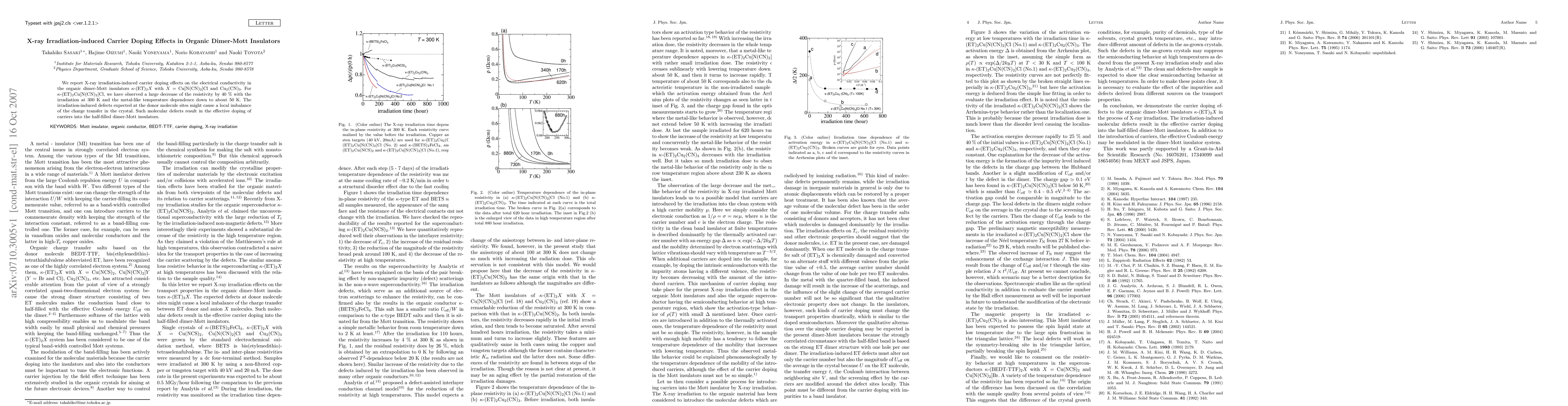This study investigates the effects of X-ray irradiation on the electrical conductivity of organic dimer-Mott insulators $\kappa$-(ET)$_{2}$$X$, finding a significant 40% reduction in resistivity and metal-like temperature dependence down to 50 K. The observed changes are attributed to irradiation-induced defects causing effective carrier doping.
