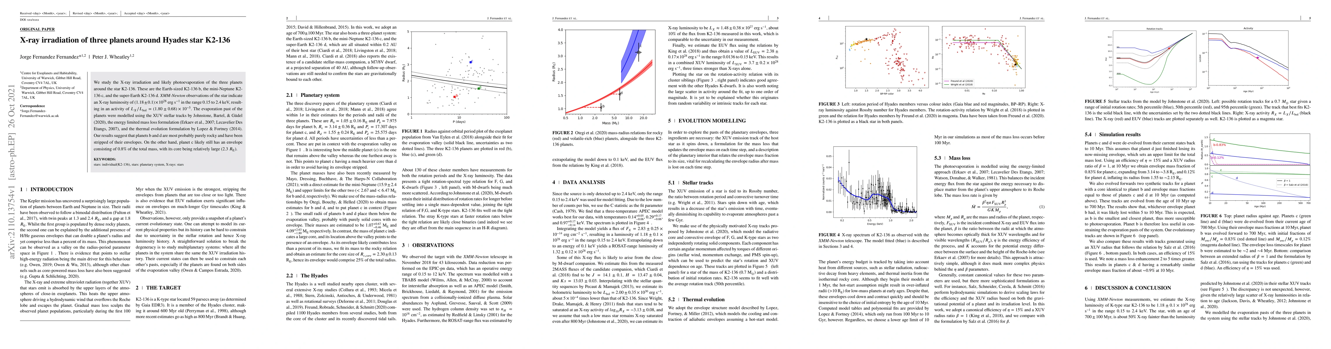 We study the X-ray irradiation and likely photoevaporation of the three planets around the star K2-136. These are the Earth-sized K2-136 b, the mini-Neptune K2-136 c, and the super-Earth K2-136 d. XMM-Newton observations of the star indicate an X-ray luminosity of $(1.18\pm0.1)\times10^{28}$ erg s$^{-1}$ in the range 0.15 to 2.4 keV, resulting in an activity of $L_X/L_{\rm bol}=(1.80\pm0.68)\times10^{-5}$. The evaporation past of the planets were modelled using the XUV stellar tracks by Johnstone et al. (2021), the energy limited mass loss formulation (Lecavelier des Etangs et al. 2007, Erkaev et al. 2007), and the thermal evolution formulation by Lopez & Fortney (2014). Our results suggest that planets b and d are most probably purely rocky and have been stripped of their envelopes. On the other hand, planet c likely still has an envelope consisting of 0.8% of the total mass, with its core being relatively large (2.3 $R_{\rm E}$).