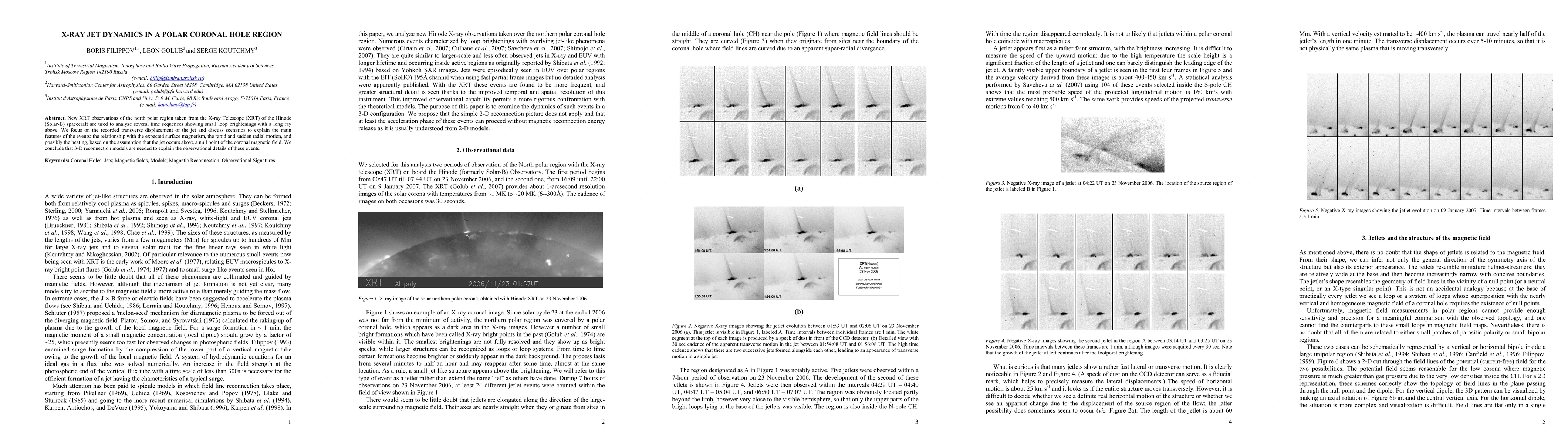 New XRT observations of the north polar region taken from the X-ray Telescope (XRT) of the Hinode (Solar-B) spacecraft are used to analyze several time sequences showing small loop brightenings with a long ray above. We focus on the recorded transverse displacement of the jet and discuss scenarios to explain the main features of the events: the relationship with the expected surface magnetism, the rapid and sudden radial motion, and possibly the heating, based on the assumption that the jet occurs above a null point of the coronal magnetic field. We conclude that 3-D reconnection models are needed to explain the observational details of these events.