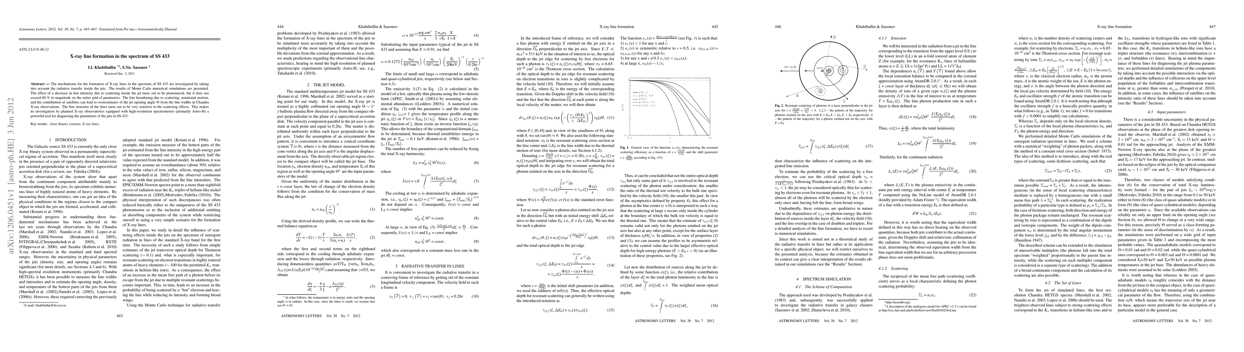This study uses Monte Carlo simulations to analyze X-ray line formation in SS 433's spectrum, finding that scattering inside jets reduces line intensity by up to 60%, but broadening due to scattering, nutational motion, and satellites can misinterpret jet opening angles from Chandra observations. The paper highlights the importance of high-resolution spectrometers like Astro-H for diagnosing jet parameters by examining line fine structure.