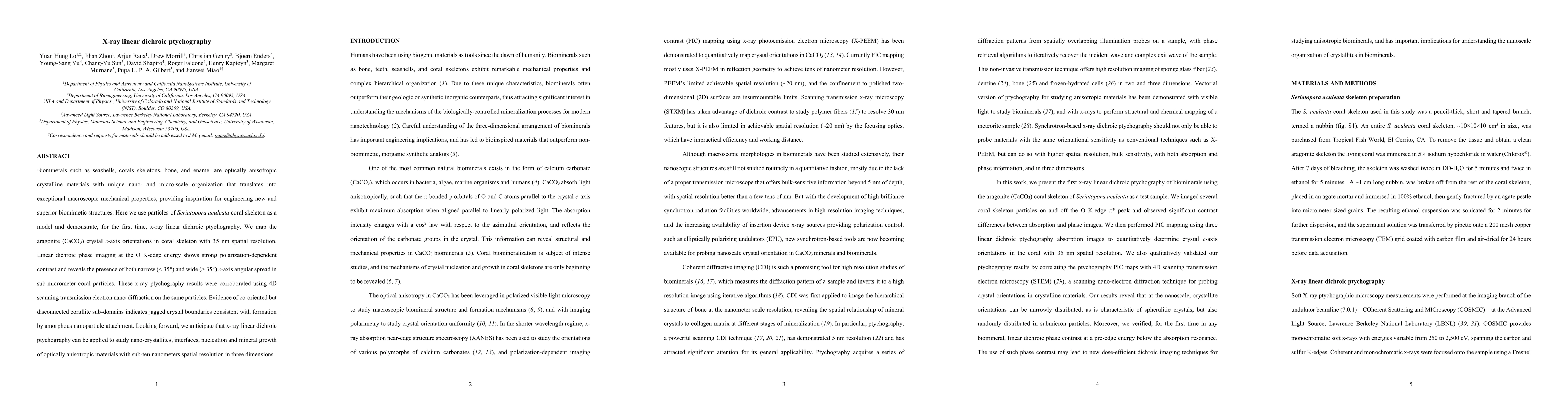 This paper introduces x-ray linear dichroic ptychography to map the crystal orientations in coral skeleton with high spatial resolution, revealing anisotropic properties and providing insights into biomimetic material engineering. The technique demonstrates polarization-dependent contrast and identifies crystal boundary structures, suggesting its potential for detailed studies of anisotropic materials.