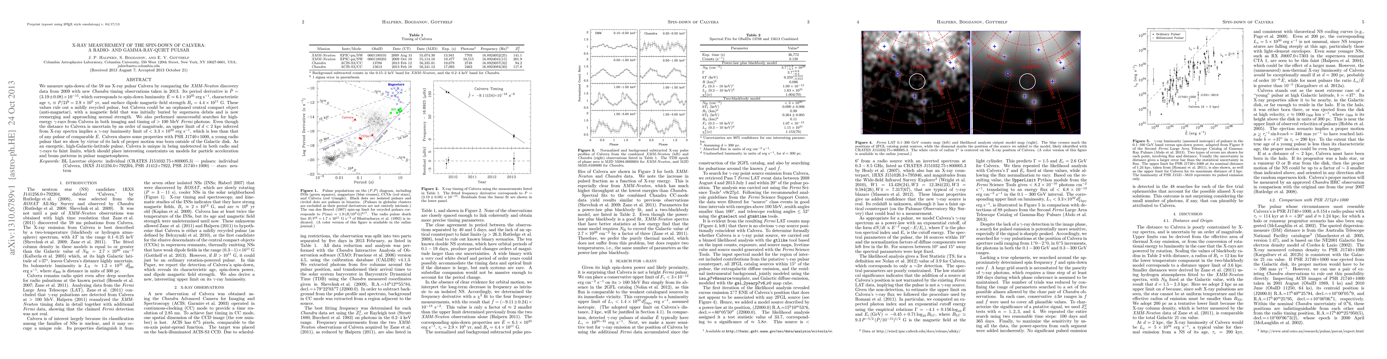 This study measures the spin-down of the X-ray pulsar Calvera using XMM-Newton and Chandra data, finding a period derivative of P-dot = (3.19±0.08)e-15, suggesting it may be an orphaned central compact object. Searches for gamma-rays were unsuccessful, providing constraints on its luminosity and unique properties compared to other pulsars.