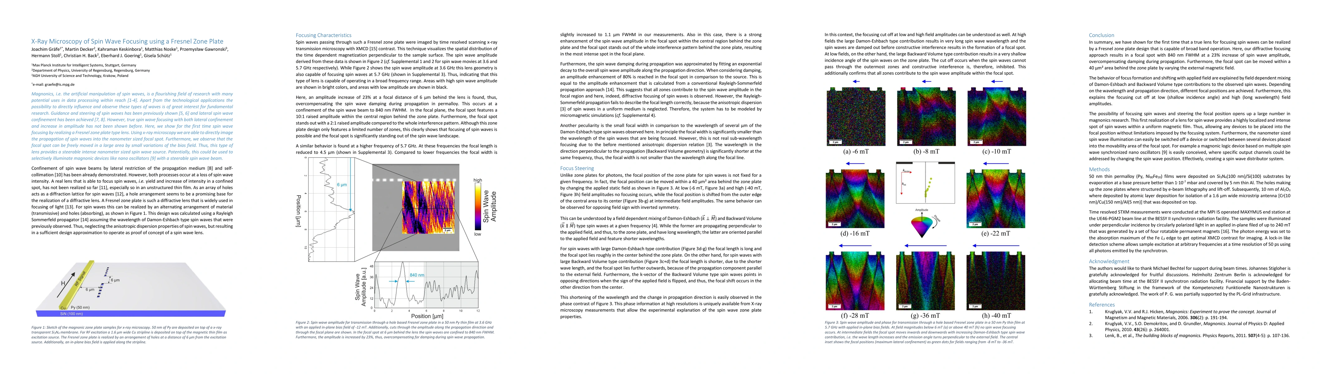 This paper demonstrates the first successful spin wave focusing using a Fresnel zone plate lens, visualized through x-ray microscopy, achieving both lateral confinement and amplitude increase. The study also reveals the ability to steer the focal spot via bias field adjustments, presenting a steerable nanometer-sized spin wave source for potential use in magnonic devices.