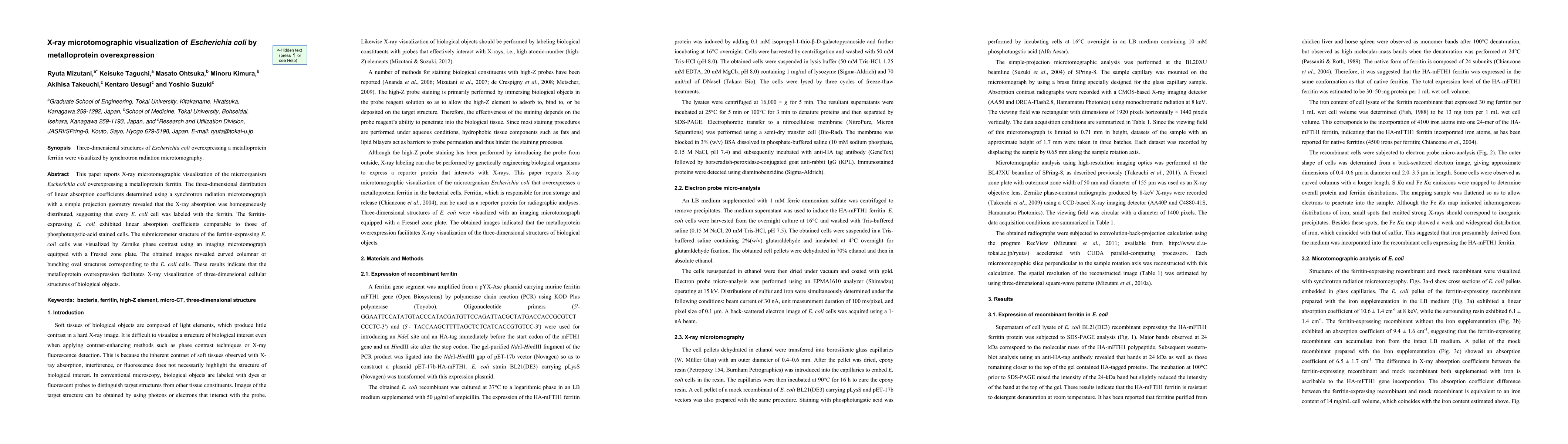 This paper demonstrates X-ray microtomographic visualization of Escherichia coli overexpressing ferritin, revealing homogeneous X-ray absorption and submicrometer cellular structures, indicating metalloprotein overexpression enhances three-dimensional cellular imaging.