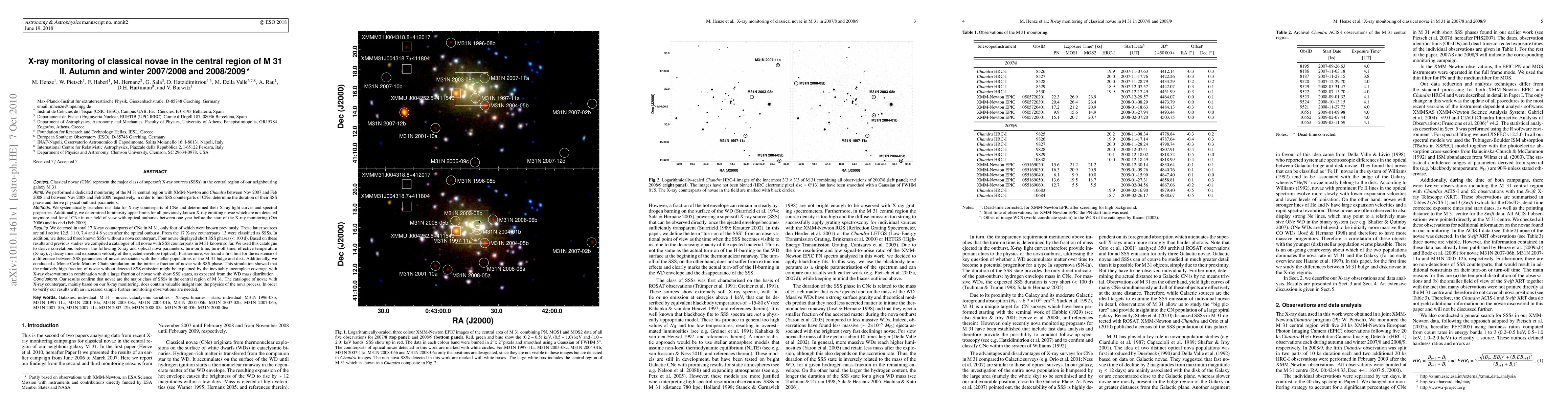 This paper reports on X-ray monitoring of classical novae in M 31's central region using XMM-Newton and Chandra, identifying 17 X-ray counterparts of CNe, including four previously known sources still active years post-outburst. The study reveals correlations between X-ray and optical nova parameters and hints at differences in SSS parameters between novae associated with M 31's bulge and disk populations.