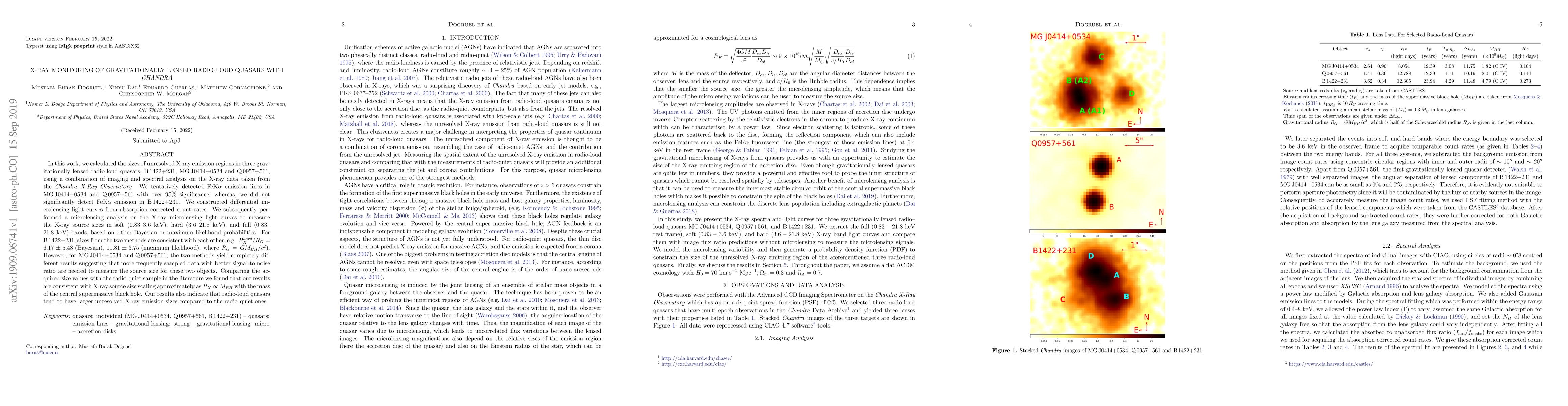 This study uses Chandra X-Ray Observatory data to measure the sizes of X-ray emission regions in three gravitationally lensed radio-loud quasars, detecting FeK$\alpha$ lines in two but not in the third. The analysis reveals that radio-loud quasars have larger unresolved X-ray sizes compared to radio-quiet ones, consistent with a scaling relation of $R_X \propto M_{BH}$.