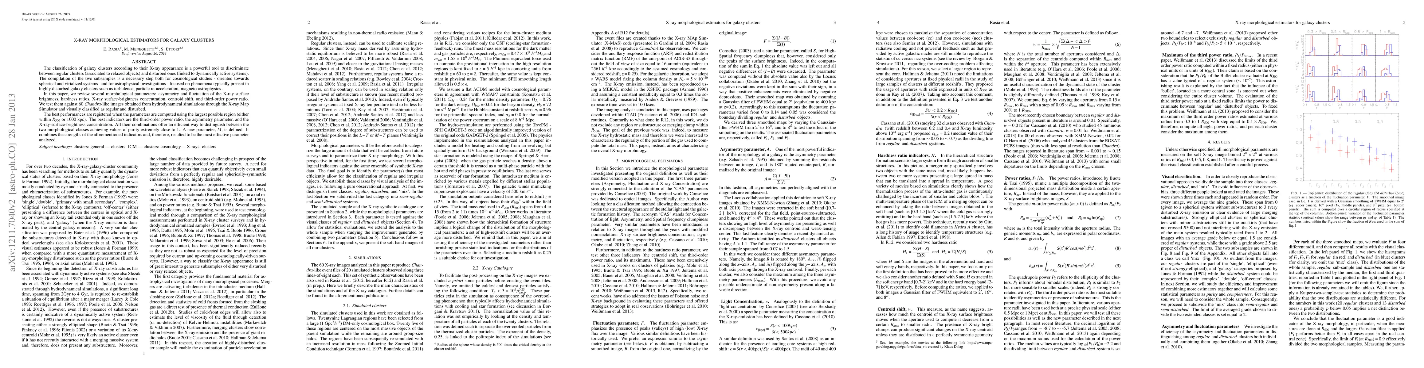 The paper presents a comprehensive analysis of various X-ray morphological estimators for galaxy clusters, identifying the third-order power ratio, asymmetry parameter, and X-ray surface-brightness concentration as the best indicators for distinguishing between regular and disturbed clusters.