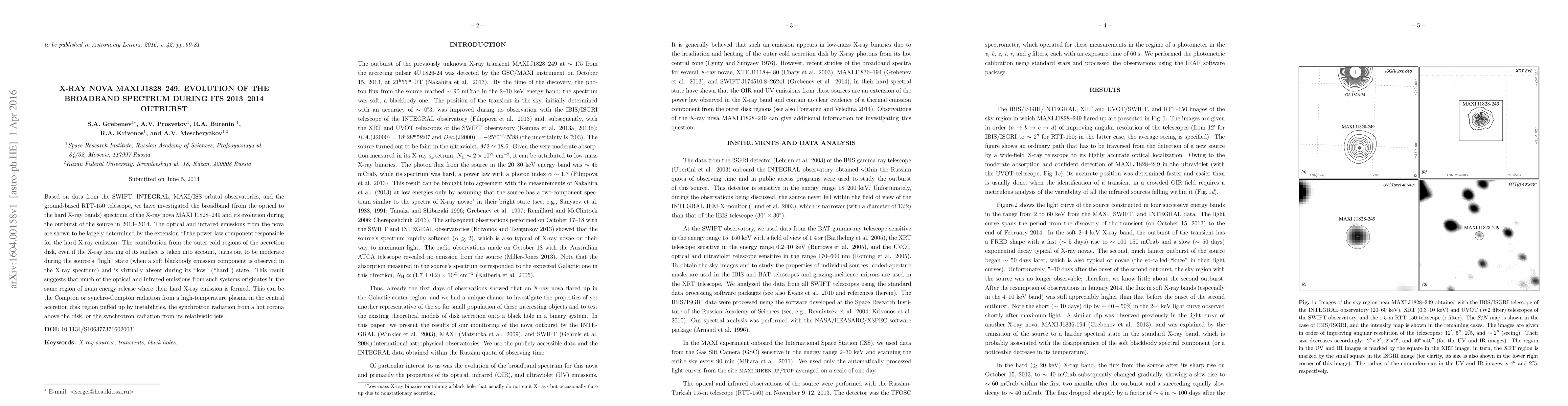 Based on data from the SWIFT, INTEGRAL, MAXI/ISS orbital observatories, and the ground-based RTT-150 telescope, we have investigated the broadband (from the optical to the hard X-ray bands) spectrum of the X-ray nova MAXI J1828-249 and its evolution during the outburst of the source in 2013-2014. The optical and infrared emissions from the nova are shown to be largely determined by the extension of the power-law component responsible for the hard X-ray emission. The contribution from the outer cold regions of the accretion disk, even if the X-ray heating of its surface is taken into account, turns out to be moderate during the source's "high" state (when a soft blackbody emission component is observed in the X-ray spectrum) and is virtually absent during its "low" ("hard") state. This result suggests that much of the optical and infrared emissions from such systems originates in the same region of main energy release where their hard X-ray emission is formed. This can be the Compton or synchro-Compton radiation from a high-temperature plasma in the central accretion disk region puffed up by instabilities, the synchrotron radiation from a hot corona above the disk, or the synchrotron radiation from its relativistic jets.