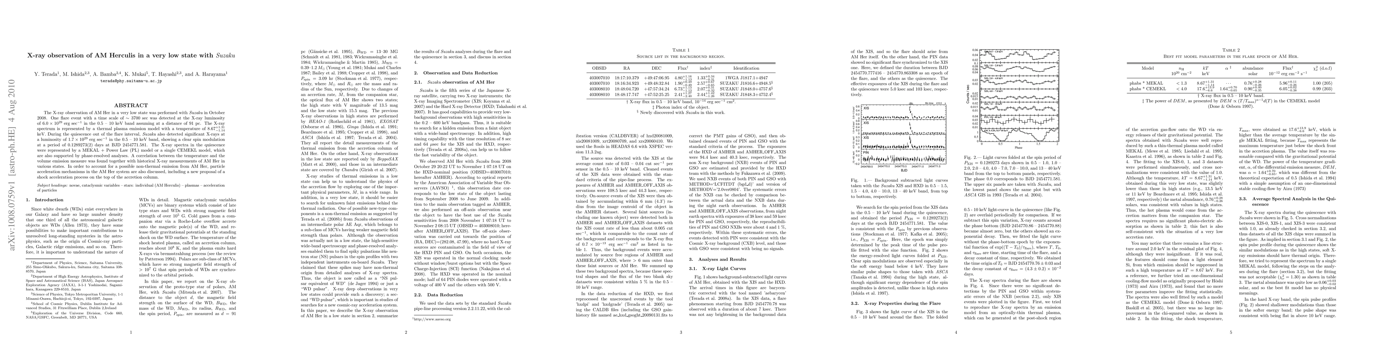 Suzaku observed AM Herculis in a very low state, detecting a flare event with a duration of ~3700 seconds at X-ray luminosity of $6.0 imes 10^{29}$ erg/sec. The X-ray spectrum was modeled with a thermal plasma emission model at ~8.67 keV. Quiescent emission showed a spin modulation period of 0.1289273 days and was described by MEKAL + Power Law or single CEMEKL models. A correlation between temperature and volume emission measure was found, and potential non-thermal emission mechanisms, including shock acceleration in accretion columns, were discussed.