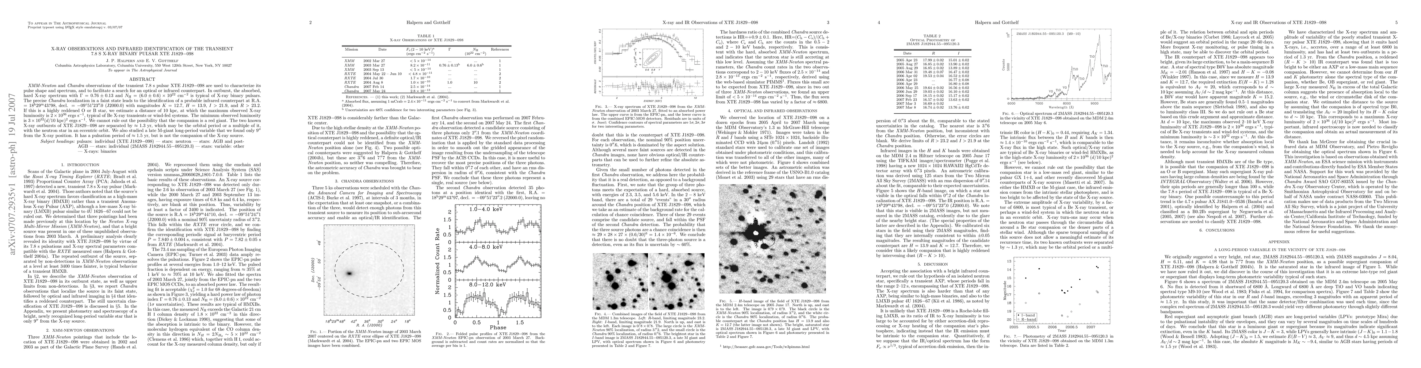 XMM-Newton and Chandra observations of the transient 7.8 s pulsar XTE J1829-098 are used to characterize its pulse shape and spectrum, and to facilitate a search for an optical or infrared counterpart. In outburst, the absorbed, hard X-ray spectrum with Gamma = 0.76+/-0.13 and N_H = (6.0+/-0.6) x 10^{22} cm^{-2} is typical of X-ray binary pulsars. The precise Chandra localization in a faint state leads to the identification of a probable infrared counterpart at R.A. = 18h29m43.98s, decl. = -09o51'23.0" (J2000.0) with magnitudes K=12.7, H=13.9, I>21.9, and R>23.2. If this is a highly reddened O or B star, we estimate a distance of 10 kpc, at which the maximum observed X-ray luminosity is 2x10^{36} ergs s^{-1}, typical of Be X-ray transients or wind-fed systems. The minimum observed luminosity is 3x10^{32}(d/10 kpc)^2 ergs s^{-1}. We cannot rule out the possibility that the companion is a red giant. The two known X-ray outbursts of XTE J1829-098 are separated by ~1.3 yr, which may be the orbital period or a multiple of it, with the neutron star in an eccentric orbit. We also studied a late M-giant long-period variable that we found only 9" from the X-ray position. It has a pulsation period of ~1.5 yr, but is not the companion of the X-ray source.