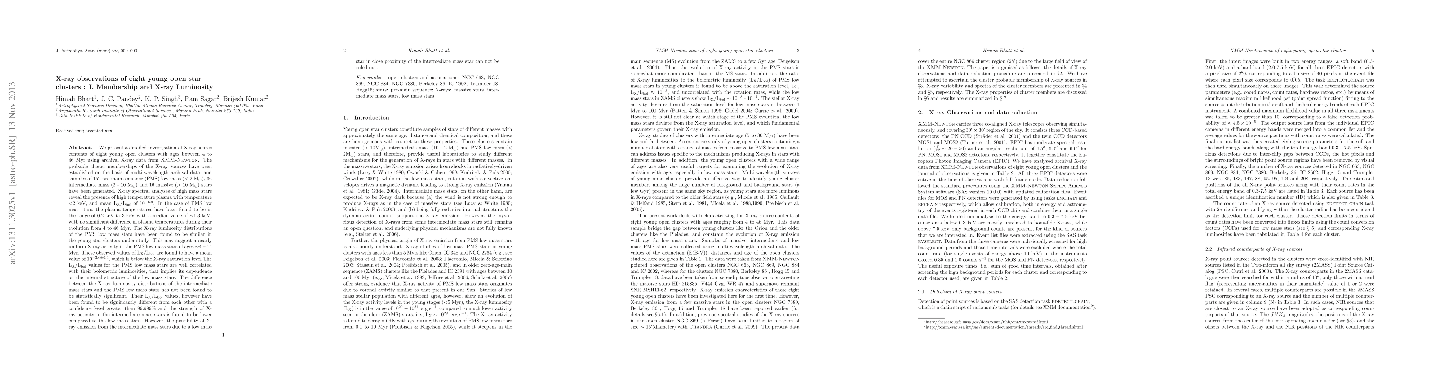 We present a detailed investigation of X-ray source contents of eight young open clusters with ages between 4 to 46 Myr using archival X-ray data from XMM-Newton. The probable cluster memberships of the X-ray sources have been established on the basis of multi-wavelength archival data, and samples of 152 pre-main sequence (PMS) low mass (< 2 M_\odot), 36 intermediate mass (2 - 10 M_\odot) and 16 massive (> 10 M_\odot) stars have been generated. X-ray spectral analyses of high mass stars reveal the presence of high temperature plasma with temperature <2 keV, and mean L_X/L_{bol} of 10^{-6.9}. In the case of PMS low mass stars, the plasma temperatures have been found to be in the range of 0.2 keV to 3 keV with a median value of ~1.3 keV, with no significant difference in plasma temperatures during their evolution from 4 to 46 Myr. The X-ray luminosity distributions of the PMS low mass stars have been found to be similar in the young star clusters under study. This may suggest a nearly uniform X-ray activity in the PMS low mass stars of ages ~4--14 Myr. These observed values of L_X/L_{bol} are found to have a mean value of 10^{-3.6\pm0.4}, which is below the X-ray saturation level.The L_X/L_{bol} values for the PMS low mass stars are well correlated with their bolometric luminosities, that implies its dependence on the internal structure of the low mass stars. The difference between the X-ray luminosity distributions of the intermediate mass stars and the PMS low mass stars has not been found to be statistically significant. Their L_X/L_{bol} values, however have been found to be significantly different from each other with a confidence level greater than 99.999%. The possibility of X-ray emission from the intermediate mass stars due to a low mass star in close proximity of the intermediate mass star can not be ruled out due to the limited spatial resolution of XMM-Newton.