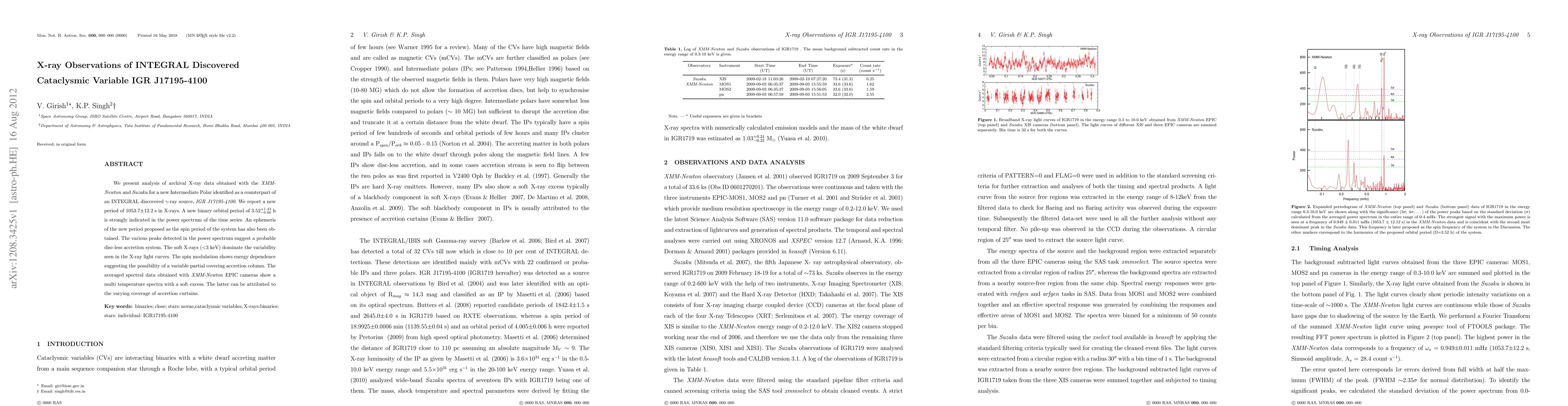 Researchers analyzed X-ray data from a newly discovered cataclysmic variable star IGR J17195-4100, finding a 1053-second spin period and suggesting it may have a disc-less accretion system with varying energy-dependent coverage.