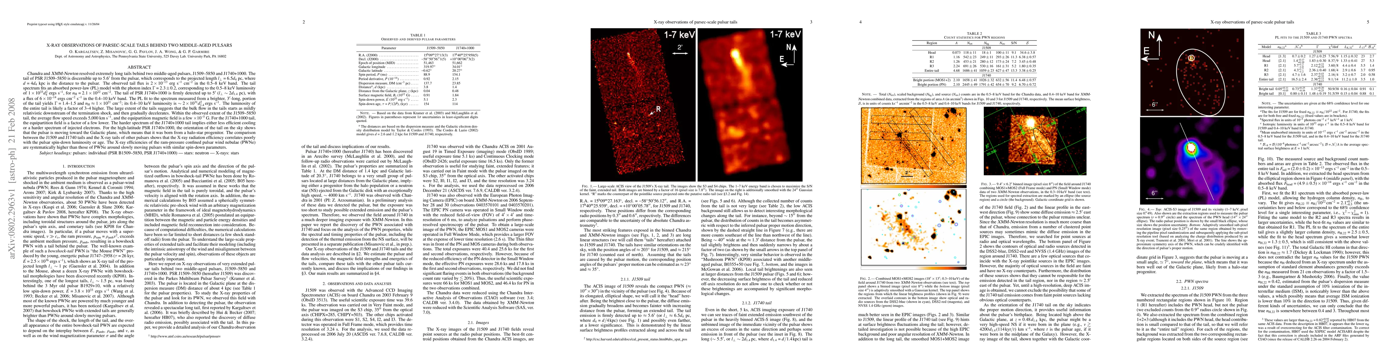 This study, using Chandra and XMM-Newton data, discovered extremely long X-ray tails behind middle-aged pulsars J1509-5850 and J1740+1000, extending 6.5 pc and 2 pc respectively. The tails' spectra fit power-law models with varying photon indices and absorption columns, suggesting mildly relativistic flows decelerating downstream. The findings imply pulsar wind nebula (PWN) X-ray radiation efficiency poorly correlates with spin-down luminosity or age, with ram-pressure confined PWNe showing higher efficiencies.