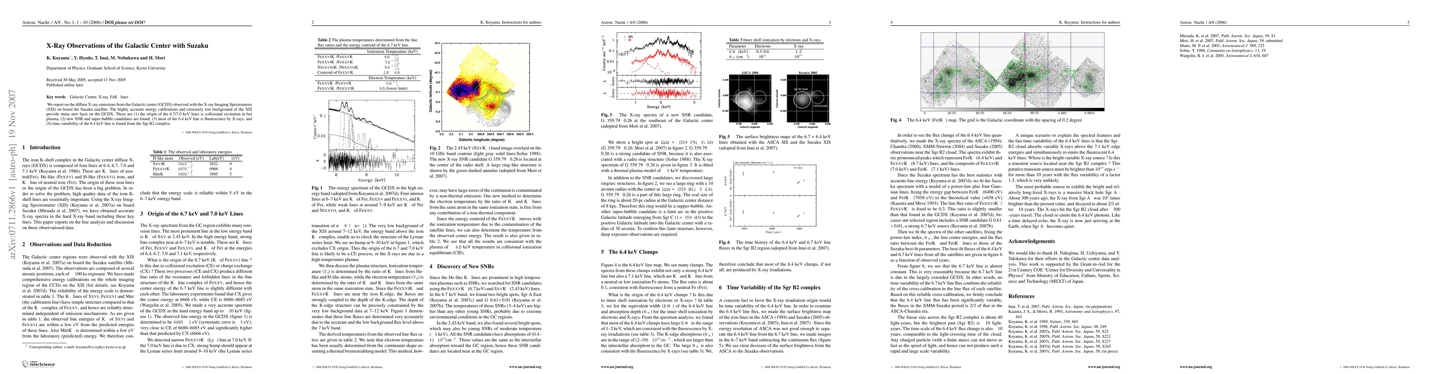 This paper reports on diffuse X-ray emissions from the Galactic Center using the Suzaku satellite's XIS, revealing that the 6.7/7.0 keV lines originate from collisional excitation in hot plasma, identifying new SNR and super-bubble candidates, and finding fluorescence and time variability of the 6.4 keV line from the SgrB2 complex.