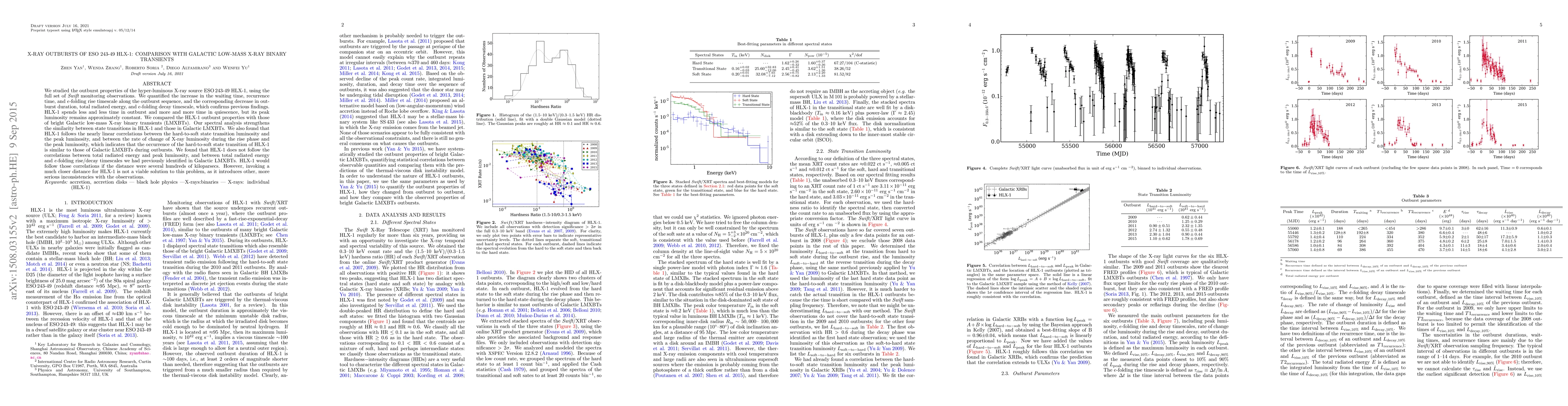 The paper studies X-ray outbursts of ESO 243-49 HLX-1, comparing them to Galactic low-mass X-ray binary transients, finding similarities in state transitions and correlations between luminosity changes.