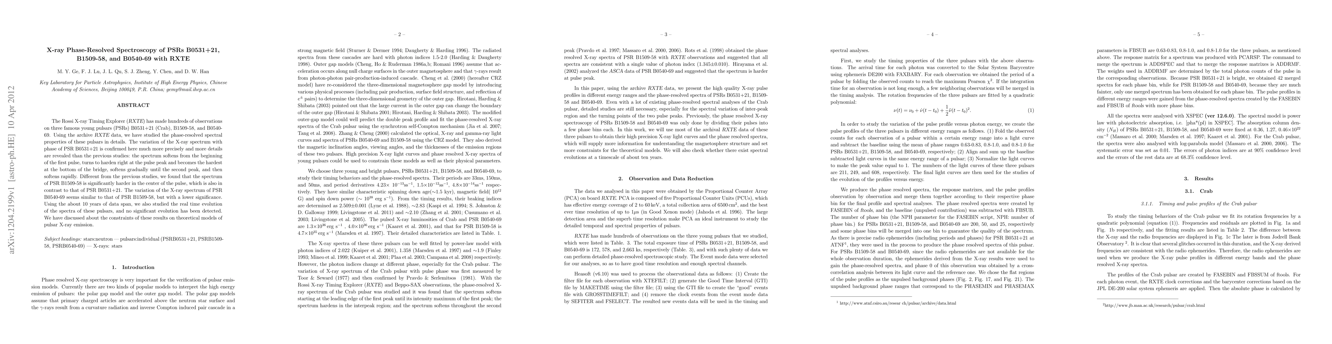 This study utilizes RXTE data to analyze the phase-resolved spectral properties of three pulsars: PSR B0531+21, B1509-58, and B0540-69. It reveals detailed spectral variations across the phases of these pulsars, with no significant long-term spectral evolution detected over a decade.