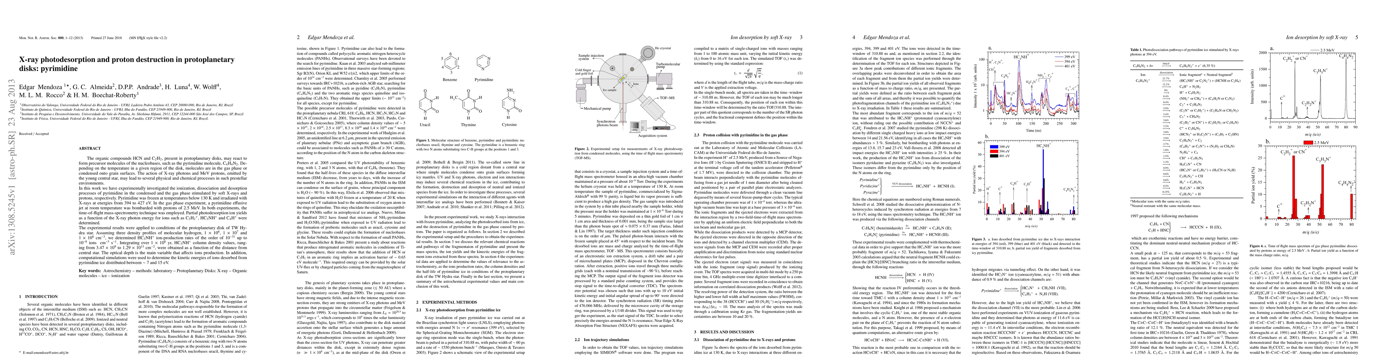 This study investigates the ionization, dissociation, and desorption of pyrimidine in protoplanetary disks under X-ray and proton irradiation. Experimental results show significant photodesorption and ion production rates, with implications for nucleobase precursor formation in such environments.