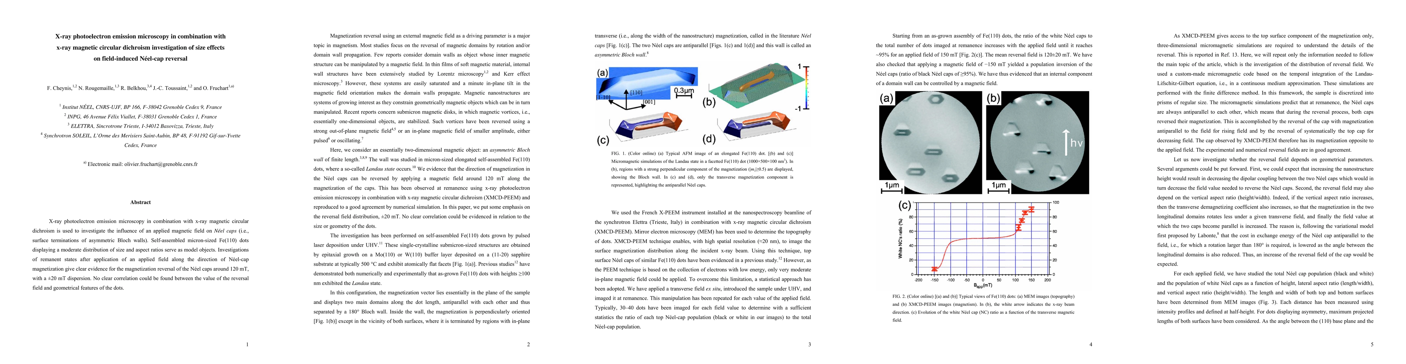 This paper combines x-ray photoelectron emission microscopy with x-ray magnetic circular dichroism to study the magnetic behavior of self-assembled Fe(110) dots under an applied magnetic field, revealing size-dependent N\'eel-cap reversal at approximately 120 mT with a dispersion of ±20 mT, independent of dot geometry.