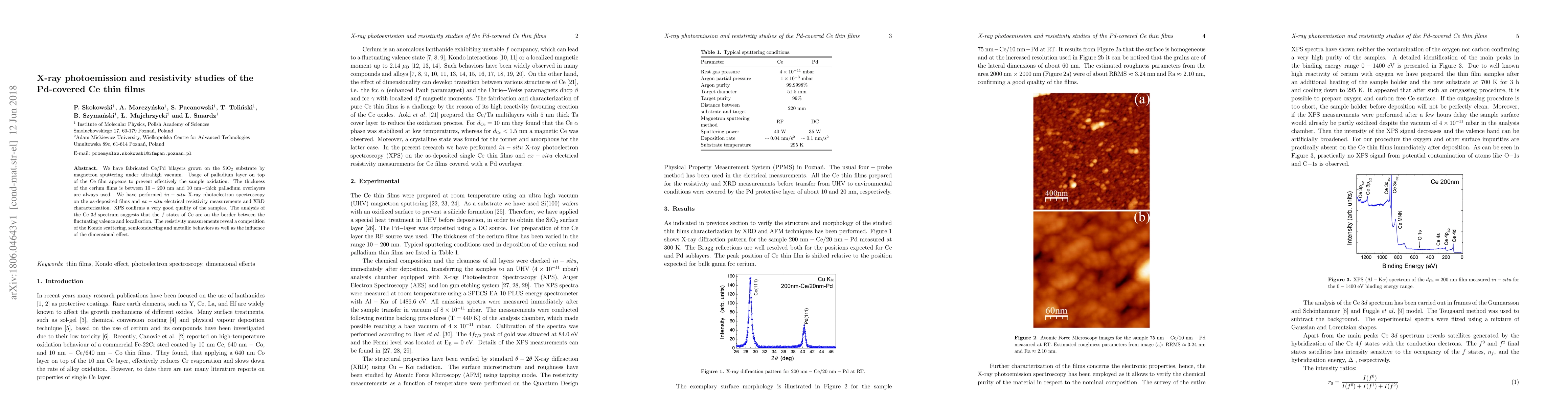 We have fabricated Ce/Pd bilayers grown on the SiO$_2$ substrate by magnetron sputtering under ultrahigh vacuum. Usage of palladium layer on top of the Ce film appears to prevent effectively the sample oxidation. The thickness of the cerium films is between 10 - 200 nm and 10 nm-thick palladium overlayers are always used. We have performed $in - situ$ X-ray photoelectron spectroscopy on the as-deposited films and $ex - situ$ electrical resistivity measurements and XRD characterization. XPS confirms a very good quality of the samples. The analysis of the Ce $3d$ spectrum suggests that the $f$ states of Ce are on the border between the fluctuating valence and localization. The resistivity measurements reveal a competition of the Kondo scattering, semiconducting and metallic behaviors as well as the influence of the dimensional effect.