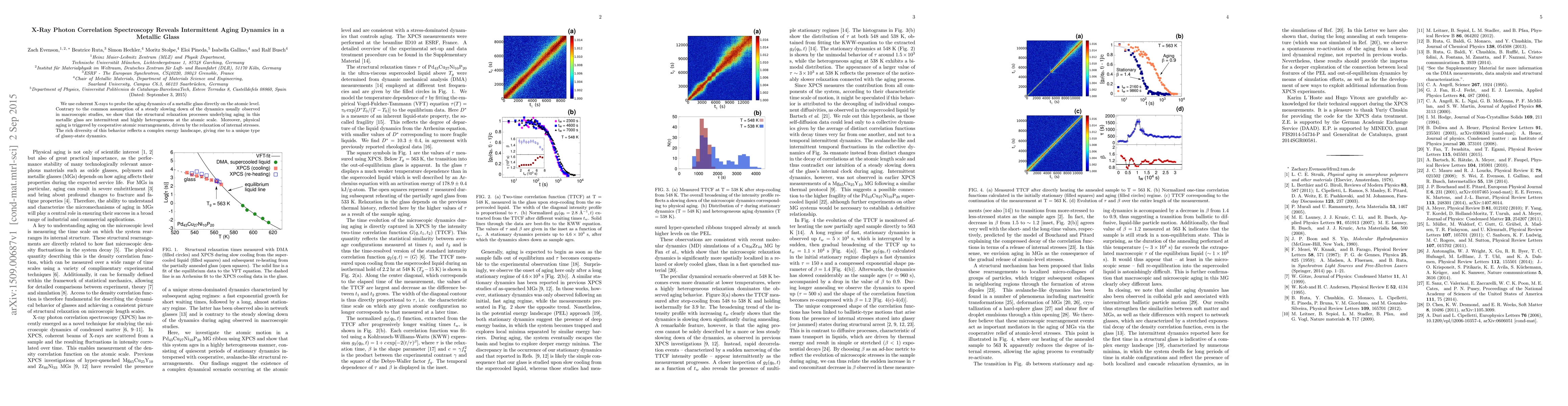 This study employs X-ray photon correlation spectroscopy to reveal that aging in metallic glass occurs through intermittent, heterogeneous atomic-scale processes, challenging the steady slowing assumption. The findings highlight cooperative atomic rearrangements driven by internal stress relaxation, showcasing a complex energy landscape and unique glassy-state dynamics.