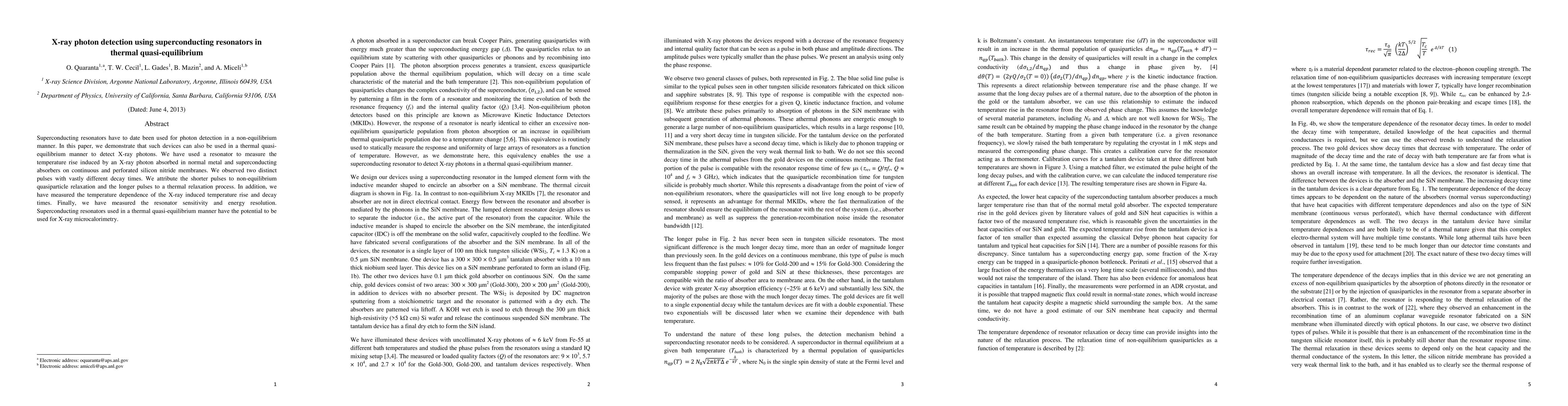 This paper demonstrates the use of superconducting resonators for detecting X-ray photons in thermal quasi-equilibrium, observing distinct pulses with different decay times and measuring temperature dependence and resonator sensitivity for potential X-ray microcalorimetry applications.